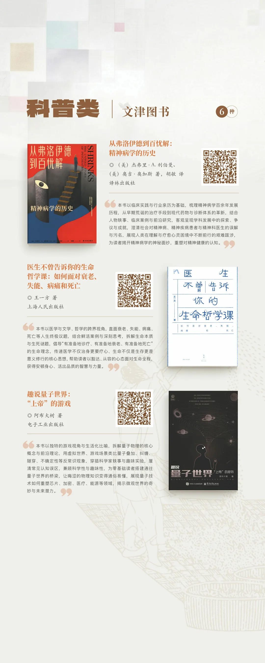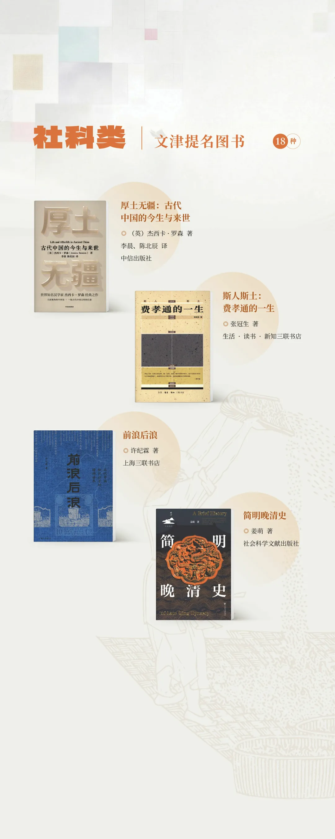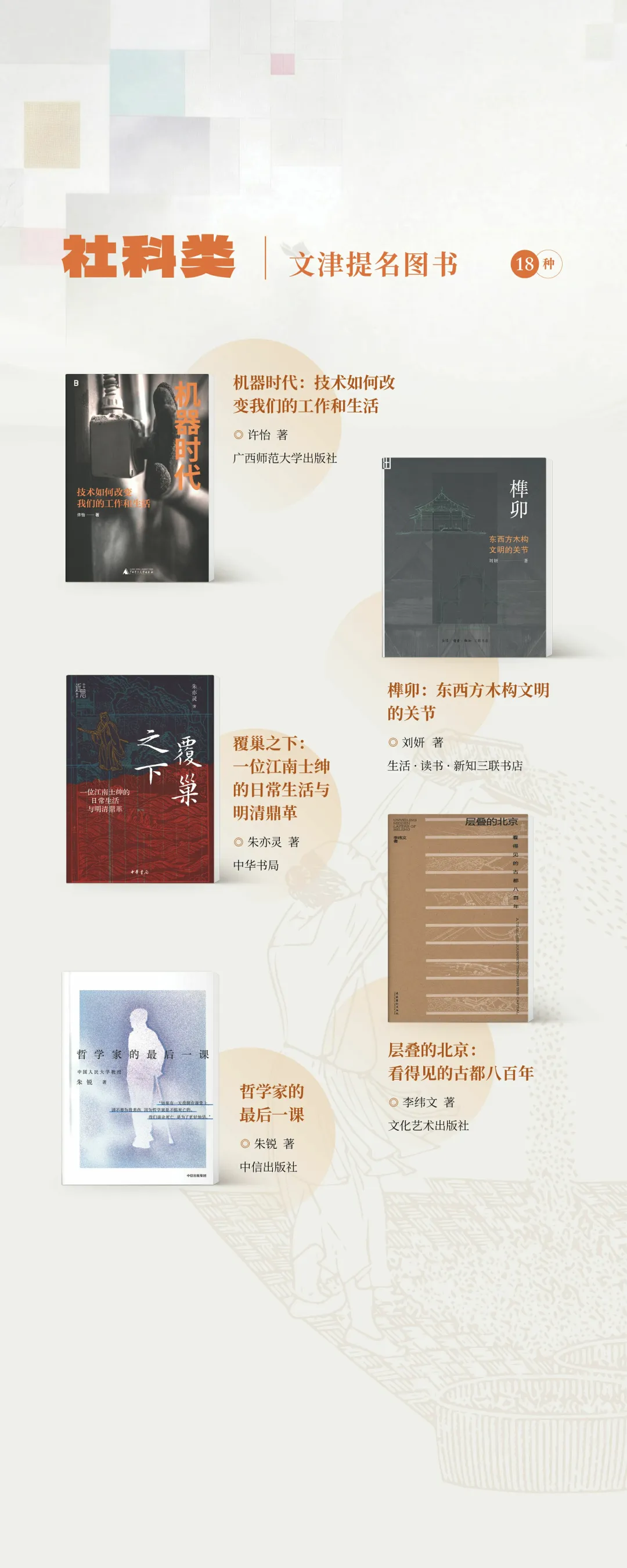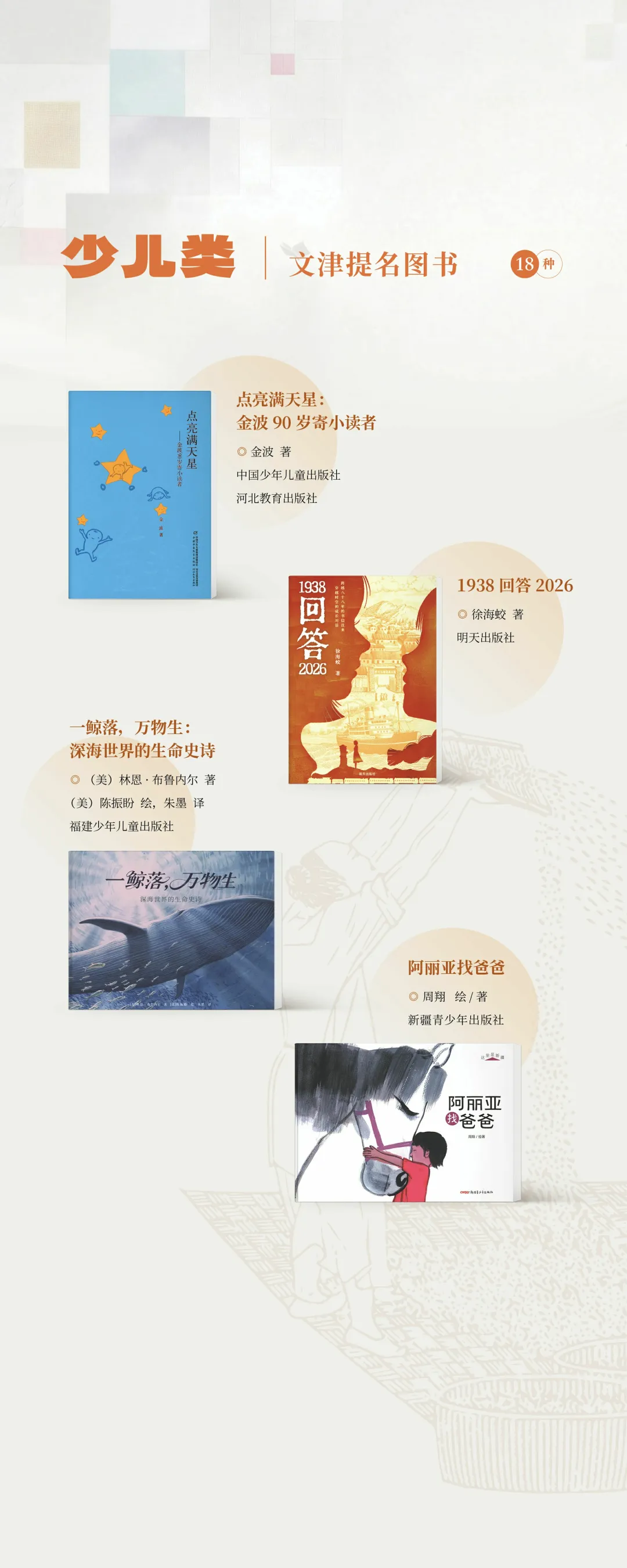 “文津图书奖”设立于2004年,是国家图书馆主办并联合全国图书馆界共同参与的公益性图书奖项。文津图书奖采用《簸扬图》为标识,有“读书如稼穑,勤耕致丰饶”之意。该奖项命名为“文津”,不仅缘起于国家图书馆四大专藏之一的“文津阁四库全书”,也寓意“文化津梁”,彰显了图书馆作为传承文化的桥梁,为促进作者、出版者和读者之间的良性互动发挥积极作用的使命。“文津图书奖”评选每年举办一次,参评图书侧重于能够传播知识、陶冶情操,提高公众思想道德素质与科学人文素养的普及性图书。2026年4月23日第二十一届揭晓,社科类、科普类、少儿类共20种(社科类8种、科普类6种、少儿类6种)图书获奖,49种图书获得提名奖。