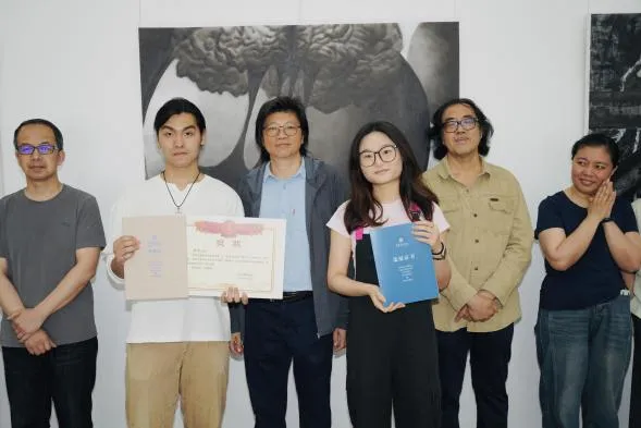 开幕仪式的最后,由天津美术学院美术馆副馆长李旭飞教授为施柯同学以及庞兴宇同学颁发奖状、收藏证书及策展证书。