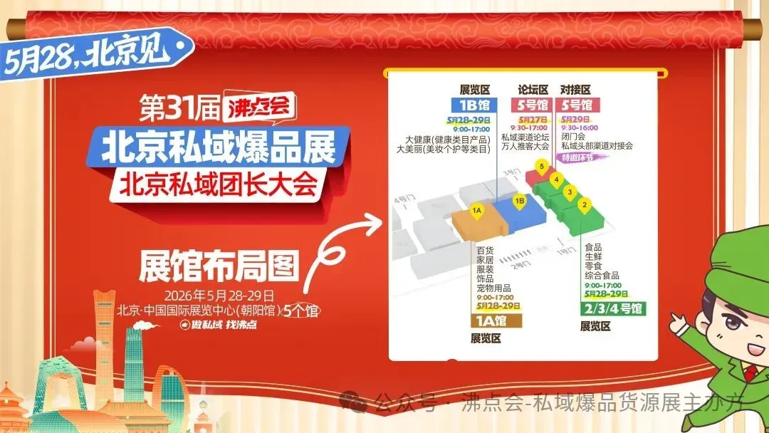 地点:中国国际展览中心(朝阳馆)5号馆时间:9:30-17:00核心内容:2026年私域、推客行业年度趋势首发!北方私域运营成功案例深度拆解,团长裂变增长、爆款选品、私域转化核心玩法全分享,还能提前和渠道、供应商初步对接,为5月28北京私域展览会正式启幕抢跑先机!