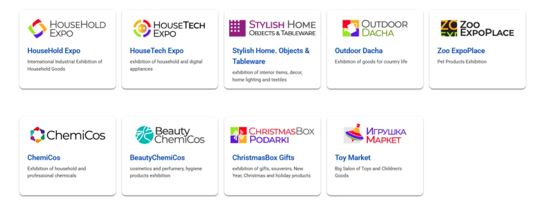 同期展会:第21届俄罗斯国际圣诞礼品展CHRISTMAS BOX PODARKI,第3届俄罗斯国际玩具展TOY-MARKET,俄罗斯宠物用品展ZOO EXPO PLACE,第26届国际时尚家居.物品和餐具室内装饰家居装饰和纺织品展Stylish Home. Objects & Tableware,第11届俄罗斯国际家用及专业化学品、美容个护及原材料展览会Chemicos & Beauty Chemicos,俄罗斯第13届户外用品、园艺展览会 OUTDOOR DACHA,俄罗斯消费电子及家用电器博览会HOUSETECH