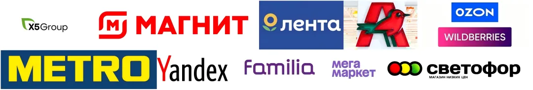 全球十大零售商之一Auchan, 俄罗斯Top5连锁商超Lenta, Perekrestok, 俄罗斯最大的超市Magnit, M-Video, Svetofor, Familia, FIXPrice, 全球零售连锁商超百强之一X5集团, Gulliver, Hamleys, HOFF, KariKIDS, Kids4Kids, Lamoda, Metro麦德龙, 俄罗斯唯一多品类综合电商平台OZON, RichFamily, Wildberries, Aist, BiblioGlobus, BubbleGum, WINNIE, VotOnIa, Detskiymir, DochkySinochky, Kangaroo, Komus, Korablik, LeroyMerlin, Lvionok, Moscow House of Books, RussianPost, SberMarket, Stockmann, Tvoy Dom, Yandex Market等