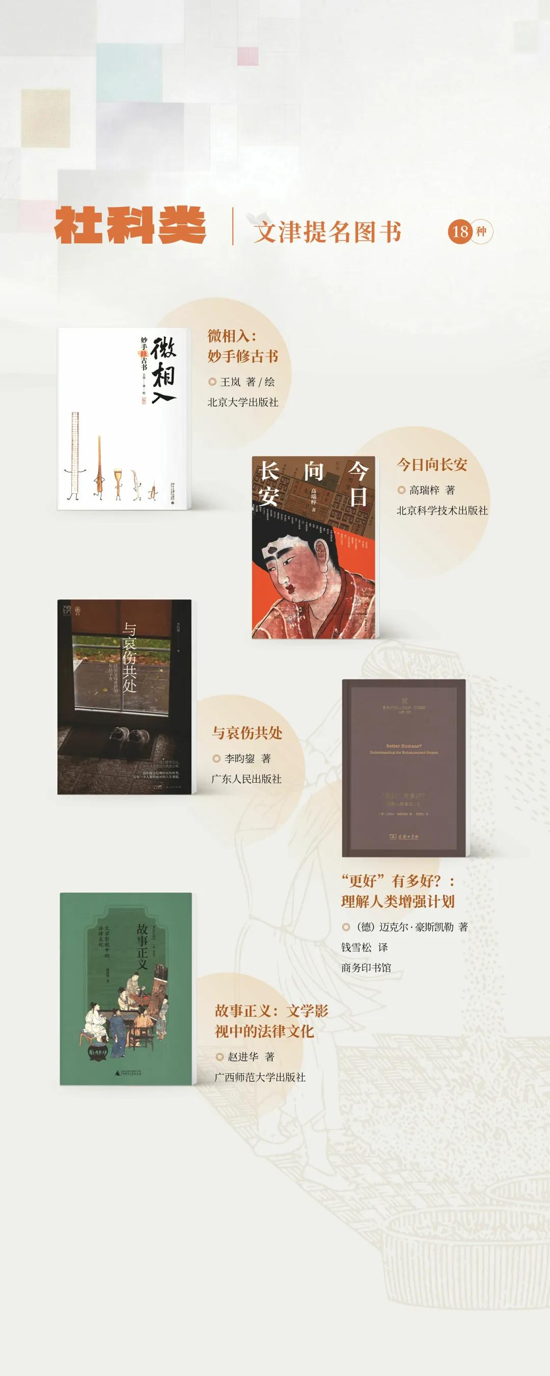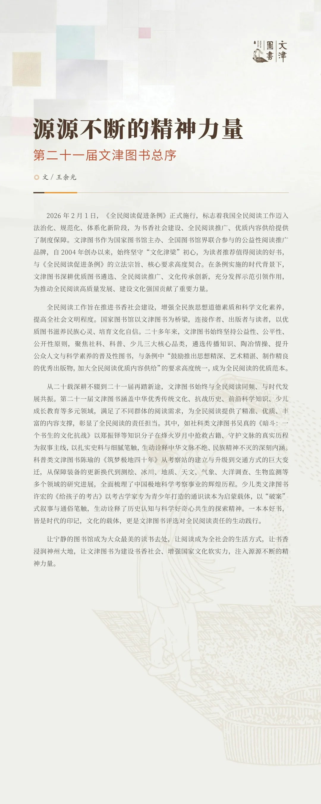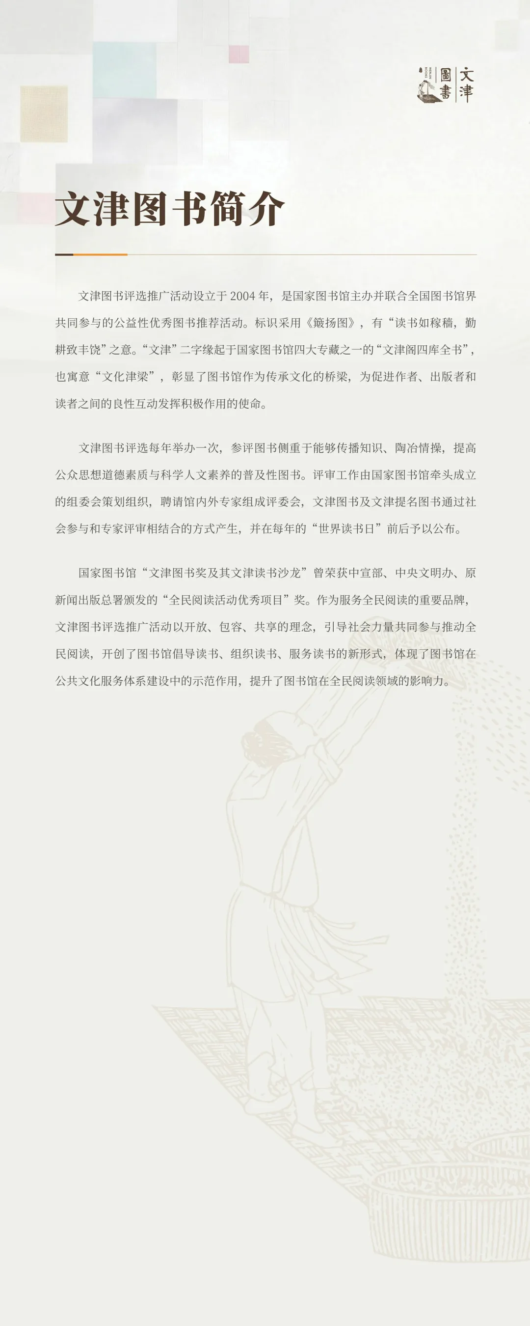 “文津图书奖”设立于2004年,是国家图书馆主办并联合全国图书馆界共同参与的公益性图书奖项。文津图书奖采用《簸扬图》为标识,有“读书如稼穑,勤耕致丰饶”之意。该奖项命名为“文津”,不仅缘起于国家图书馆四大专藏之一的“文津阁四库全书”,也寓意“文化津梁”,彰显了图书馆作为传承文化的桥梁,为促进作者、出版者和读者之间的良性互动发挥积极作用的使命。“文津图书奖”评选每年举办一次,参评图书侧重于能够传播知识、陶冶情操,提高公众思想道德素质与科学人文素养的普及性图书。2026年4月23日第二十一届揭晓,社科类、科普类、少儿类共20种(社科类8种、科普类6种、少儿类6种)图书获奖,49种图书获得提名奖。