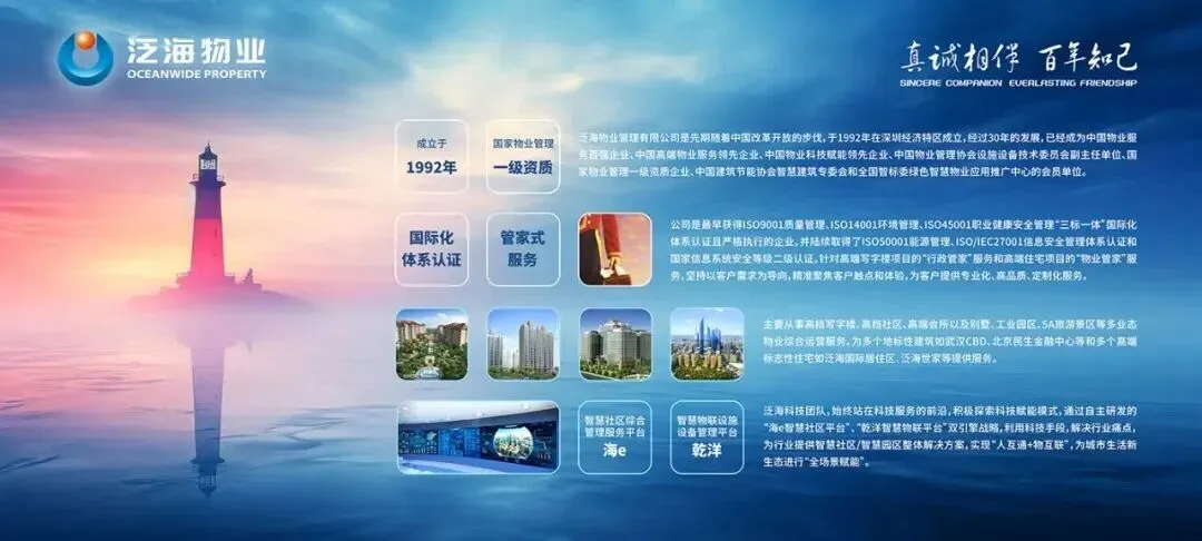 作为国内首批获得国家物业管理一级资质的企业之一,自1992年创立以来,泛海物业三十余载栉风沐雨,始终秉承"真诚相伴,百年知己"的核心服务理念,以"让生活更舒适、让资产更增值、让城市更美好"为使命,构建起覆盖高端写字楼、高端住宅、别墅、工业园区、城市综合体等全业态的综合运营服务体系。