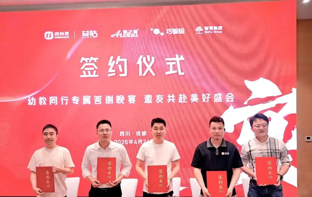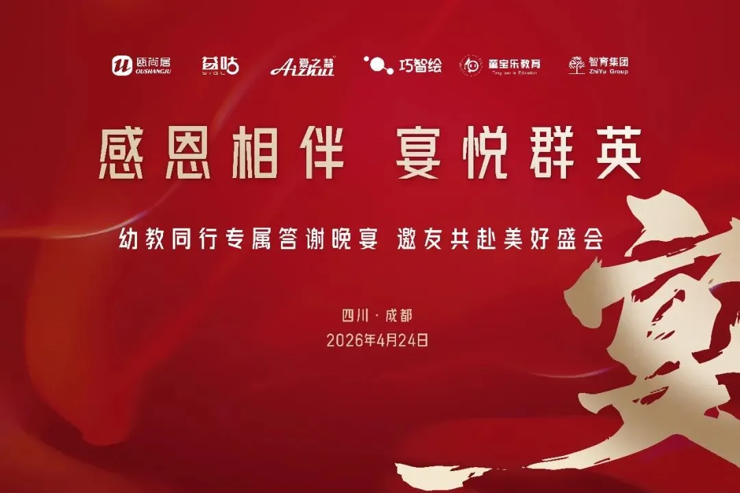 展会开展当晚,2026年4月24日,由四川爱之慧教学用品有限公司、浙江温尚教玩具有限公司、杭州益咕科技有限公司、巧智绘科技(浙江)有限公司、杭州童宝乐教育科技有限公司、上海智育科技集团有限公司六家联合主办的 “幼教同行专属答谢晚宴” 在武侯区成都华尔道夫酒店宴会厅顺利举行。