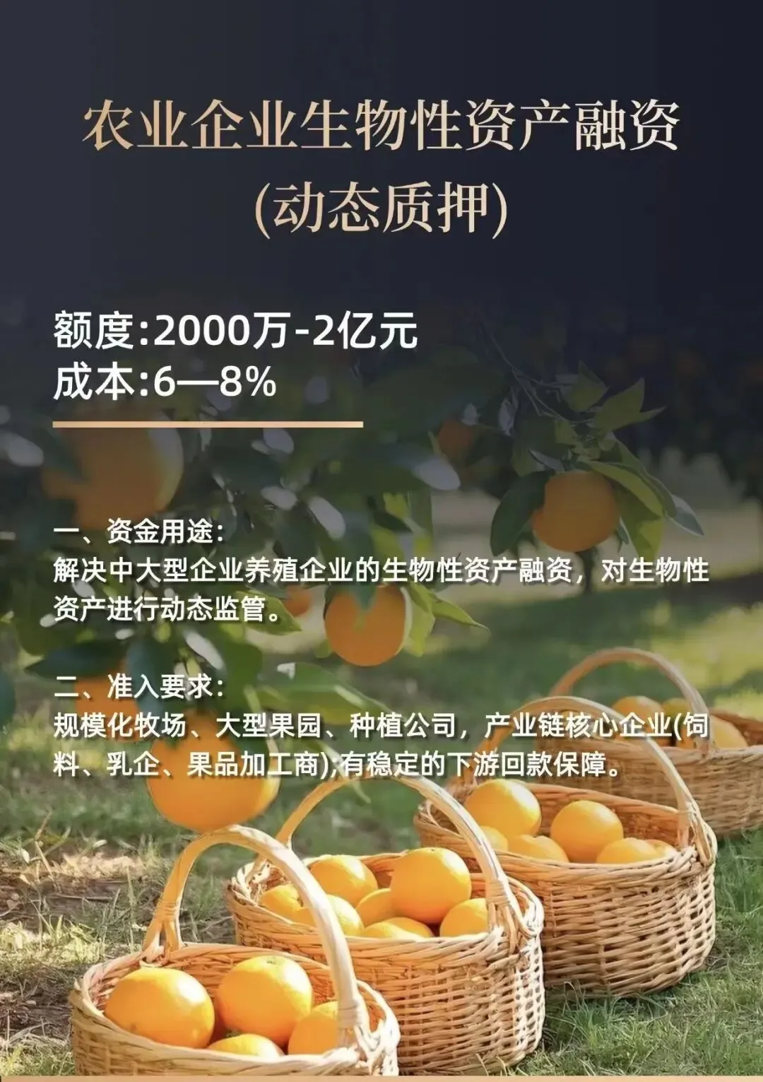 本融资方案专门针对农业企业生物性资产进行动态监管质押,额度覆盖 2000万元至2亿元,资金成本为年化6.8%。
