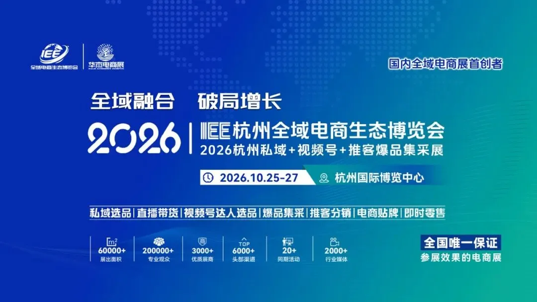 2026IEE杭州全域电商生态博览会将于2026年10月25日至27日在杭州国际博览中心盛大举办。博览会现已全面启动展位预定及观众预登记。