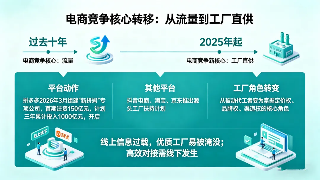 从2025年开始,各大电商平台不约而同地押注“工厂直供”。拼多多于2026年3月组建“新拼姆”专项公司,首期注资150亿元,计划三年累计投入1000亿元,全面开启自营品牌模式,直击中国供应链“有制造无品牌”的痛点。抖音电商、淘宝、京东等平台也纷纷推出针对源头工厂的扶持计划。