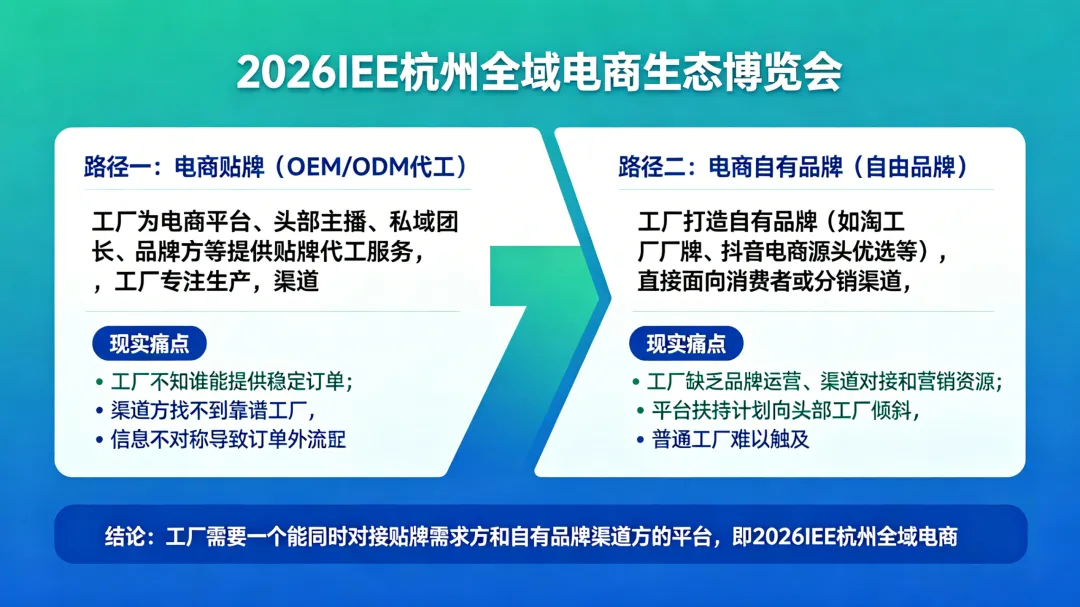 结论: 无论走哪条路,工厂都需要一个能够同时对接贴牌需求方和自有品牌渠道方的平台。这个平台,就是2026IEE杭州全域电商生态博览会。