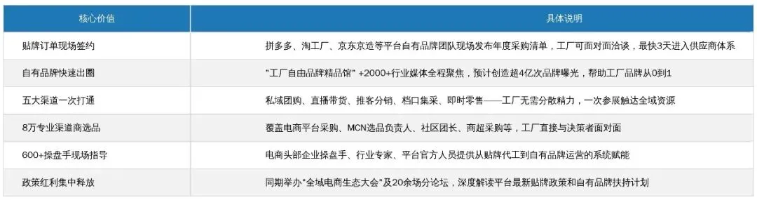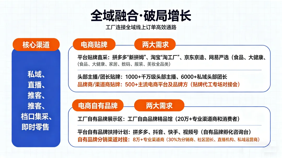 平台贴牌直采: 拼多多“新拼姆”、淘宝“淘工厂”、京东京造、网易严选等平台自有品牌团队将现场发布年度贴牌采购需求,涵盖食品、大健康、家居、数码、服装、美妆等全品类。工厂可直接对接采购负责人,进入平台贴牌供应商库。