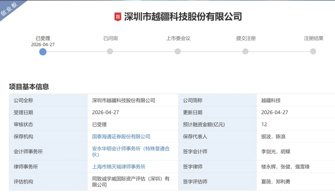 越疆科技在2026年4月27日提交IPO被受理,由国泰海通保荐,会计师事务所为安永华明会计师事务所(特殊普通合伙),律师事务所为上海市锦天城律师事务所。2、越疆科技港股情况