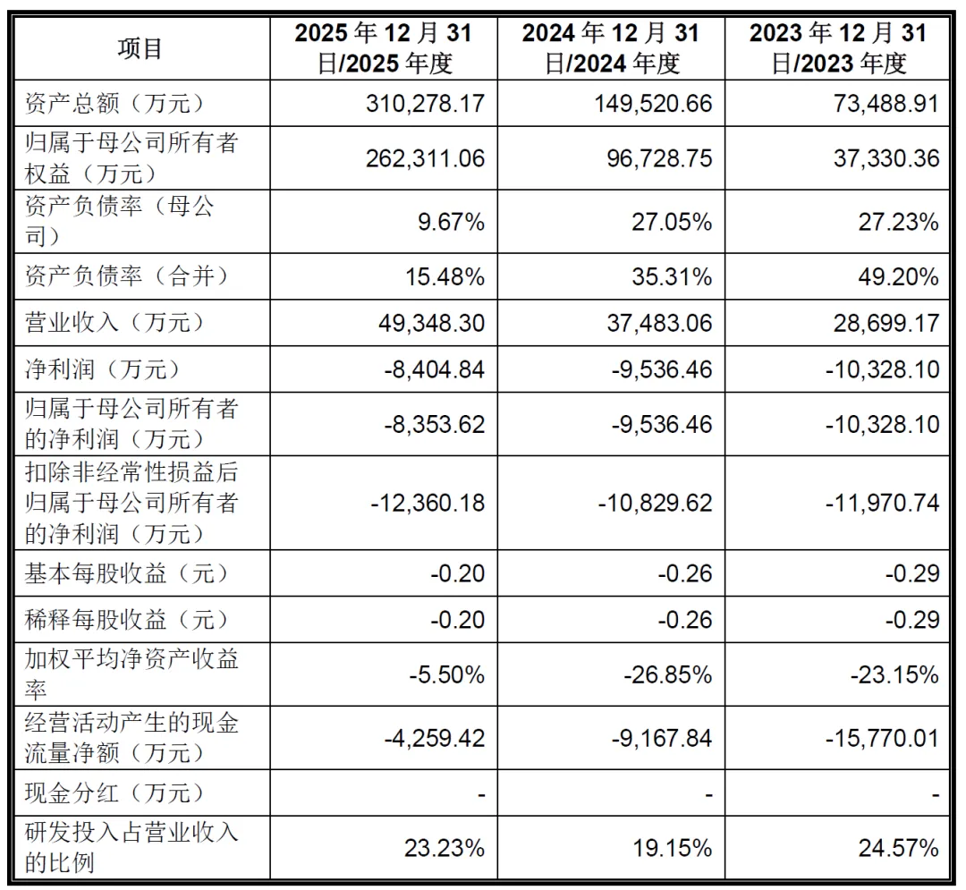 根据招股书披露,2023-2025年公司营业收入分别为2.87亿元、3.75亿元、4.93亿元,呈现持续稳定增长;扣非归母净利润分别为-1.2亿元、-1.08亿元、-1.24亿元,还处于持续亏损阶段。综合毛利率分别为48.47%、47.95%和46.49%,整体保持稳定且处于较高水平。公司本次发行上市申请适用《深圳证券交易所创业板股票上市规则》第2.1.2 条第(三)项规定的上市标准:预计市值不低于50亿元,且最近一年营业收入不低于3亿元。5、主营业务收入构成