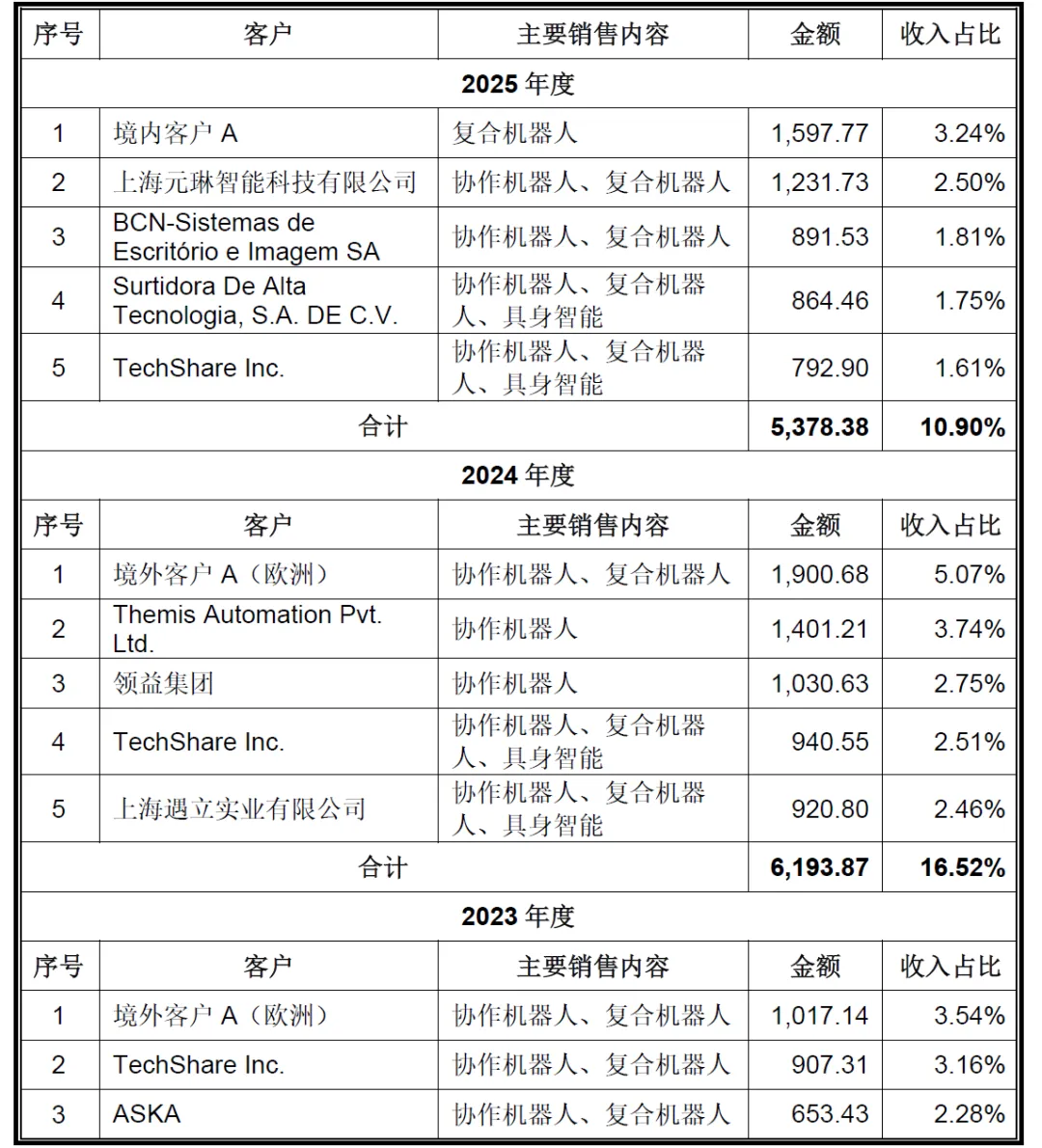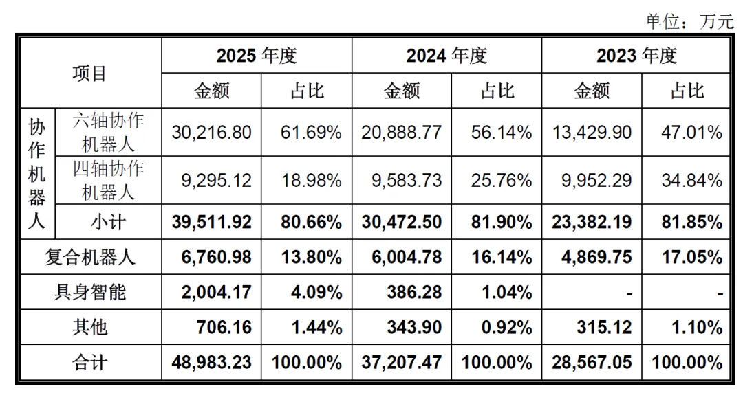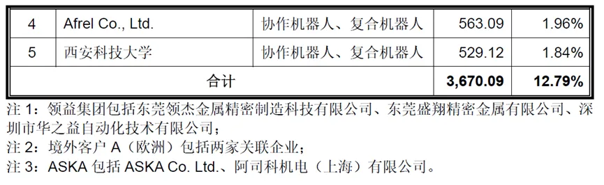 公司2023-2025年主营业务收入分别为2.86亿元、3.72亿元、4.9亿元,其中协作机器人分别为2.34亿元、3.05亿元、3.95亿元,收入占比分别为81.85%、81.9%、80.66%,占比比例较为稳定。具身智能机器人在2024年推出,营业收入从386.28万元增长至2025年的2004.17万元。6、前五大客户