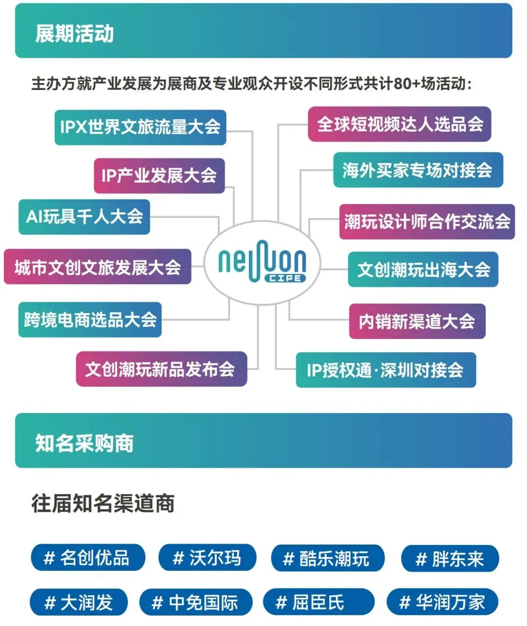 展会同步联动深圳国际IP授权博览会、文旅文创产业峰会、全球潮玩选品大会,实现「文创+IP+文旅+潮玩+科技」五维联动,打造国内独有的全闭环文创产业生态展会。