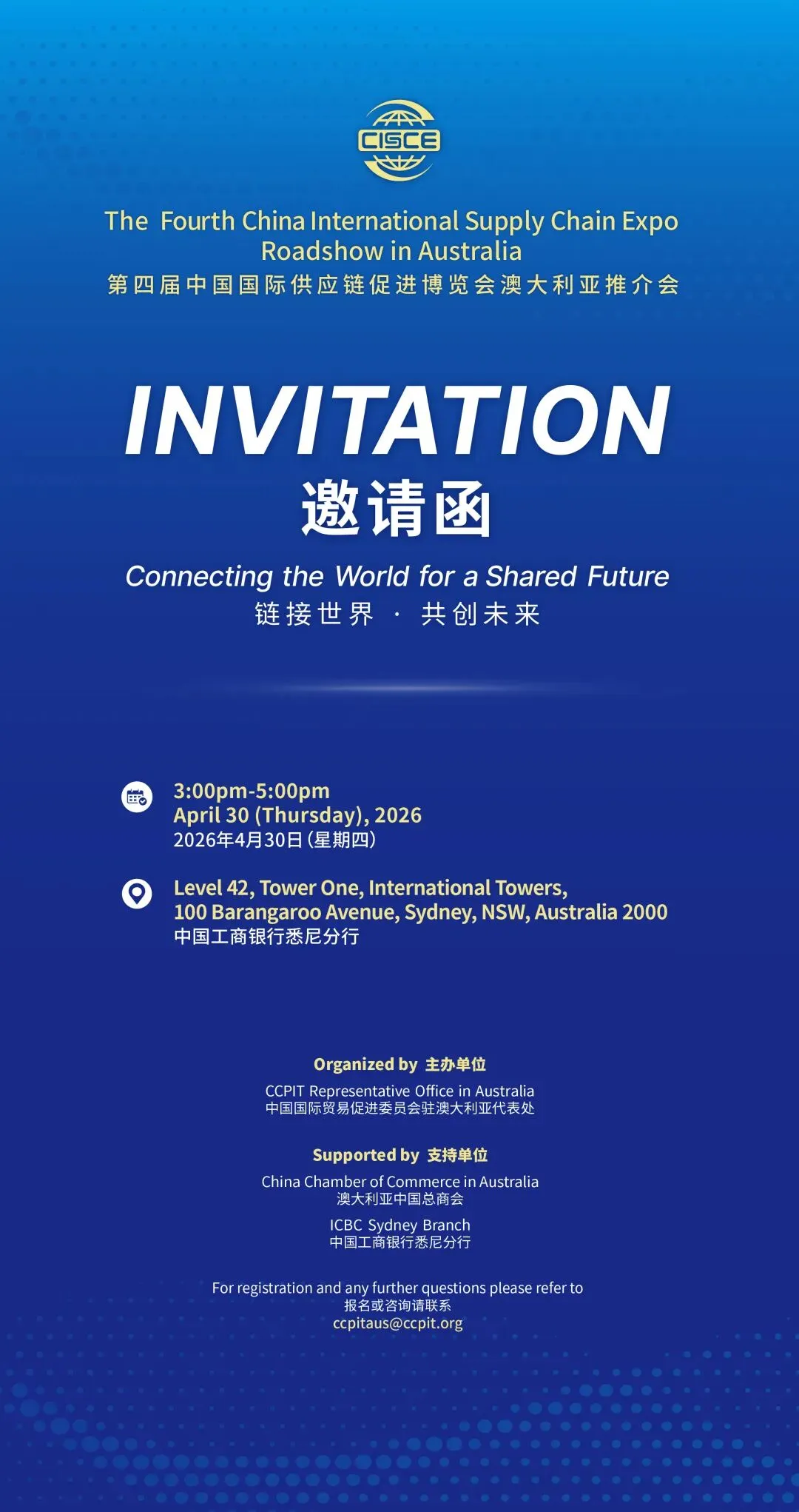 中国贸促会驻澳大利亚代表处将于2026年4月30日在悉尼举办链博会澳大利亚推介会,介绍本届博览会有关情况。