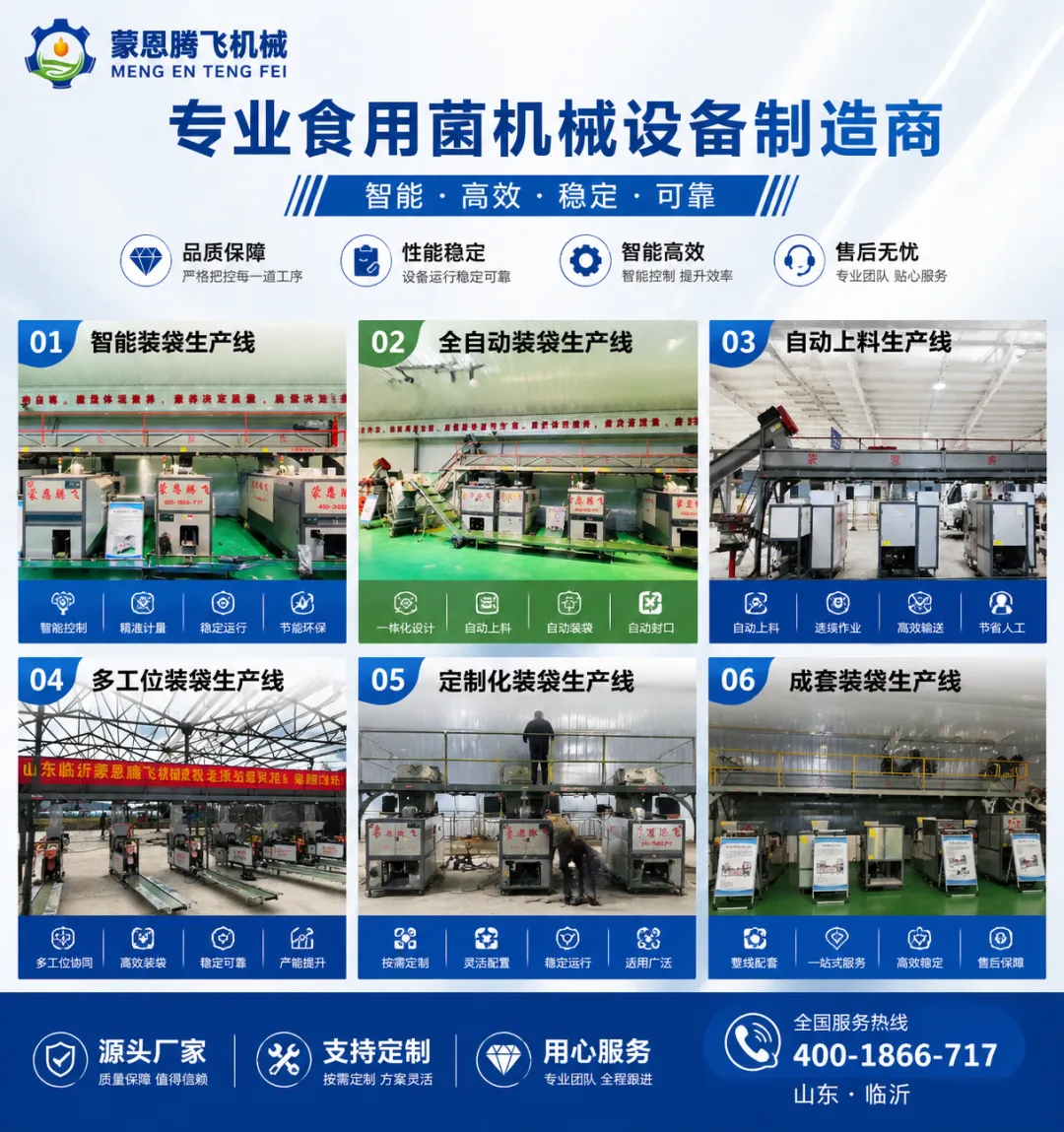 告别传统人工装袋的低效与繁琐,拥抱自动化生产带来的高效与稳定。蒙恩腾飞机械设备有限公司始终聚焦食用菌设备的研发与制造,用专业的技术和可靠的产品,助力每一位食用菌从业者,在产业升级的道路上稳步前行,收获更高的效率与收益。