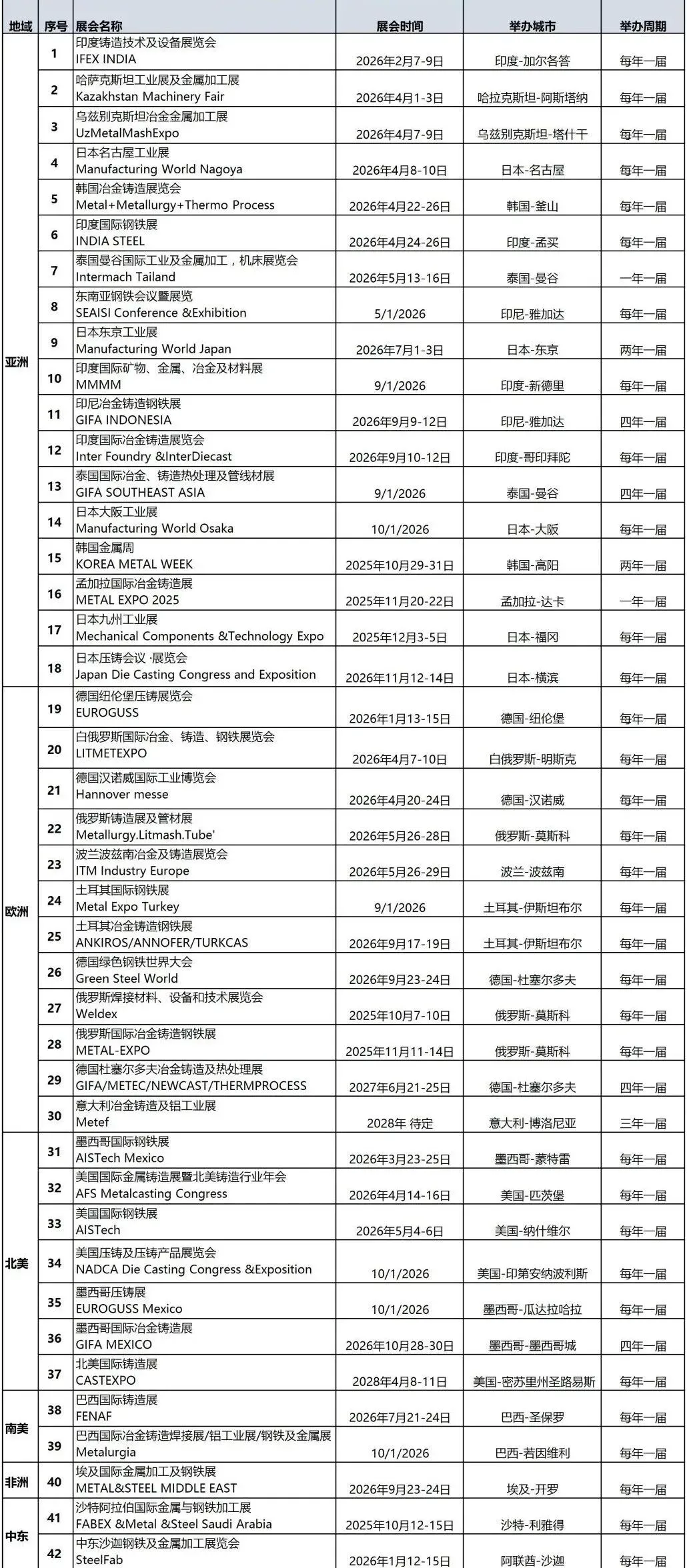 2026年全球冶金铸造展会计划表