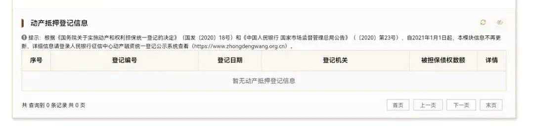 国家企业信用信息公示系统动产抵押登记信息模块载明,“自2021年1月1日起,本模块信息不再更新,详细信息请登录人民银行征信中心动产融资统一登记公示系统查看”(详见图3)。