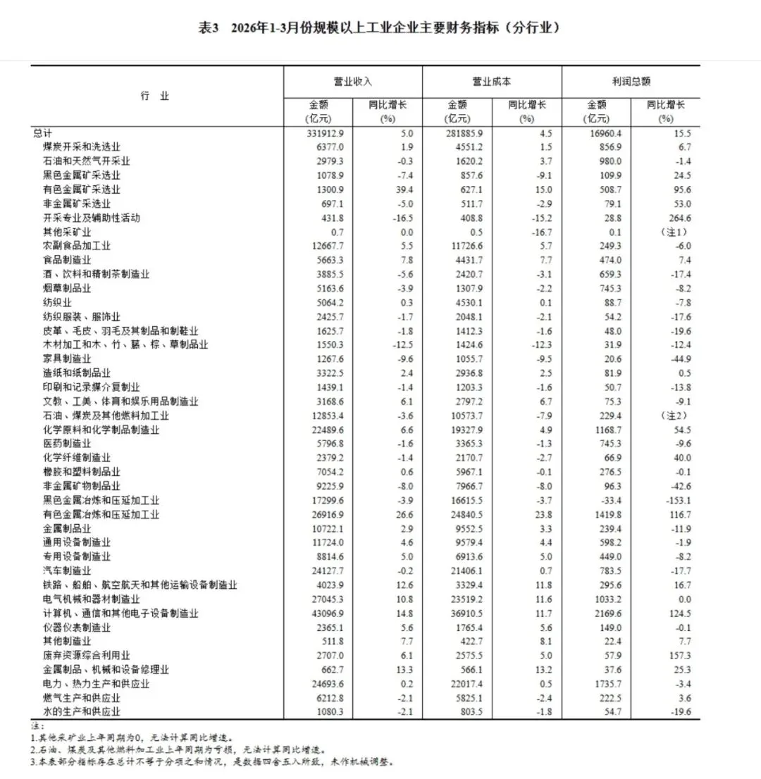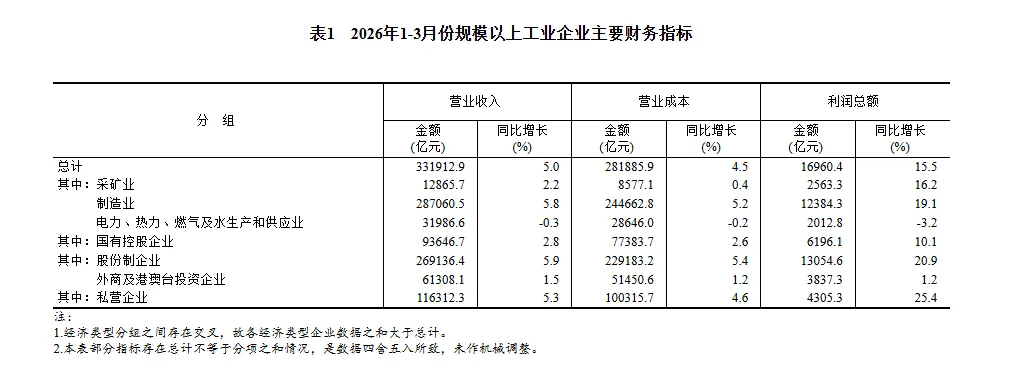 1—3月份,全国规模以上工业企业实现利润总额16960.4亿元,同比增长15.5%(按可比口径计算,详见附注二)。