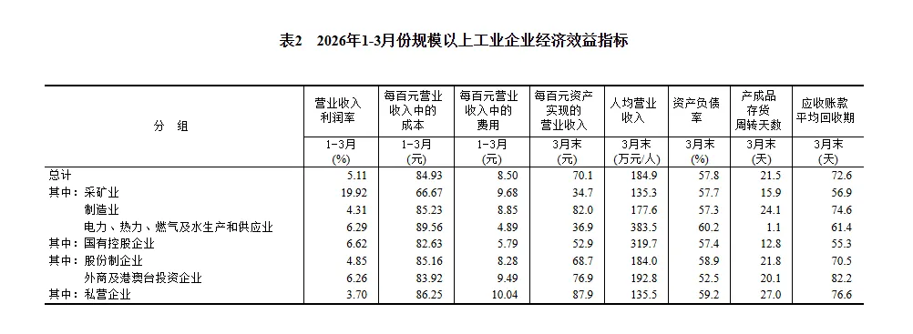 3月末,规模以上工业企业资产总计190.50万亿元,同比增长5.3%;负债合计110.19万亿元,增长5.5%;所有者权益合计80.31万亿元,增长5.1%;资产负债率为57.8%,同比持平。