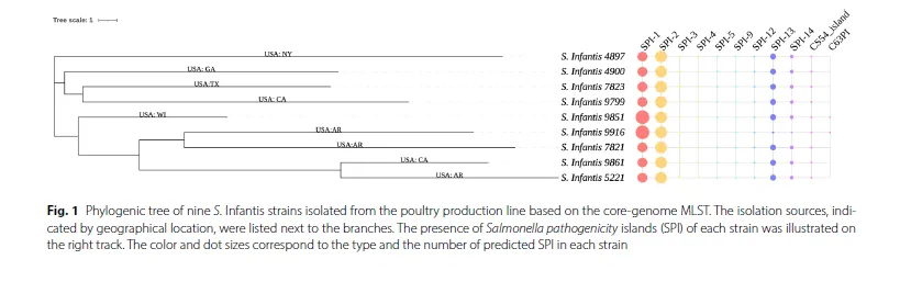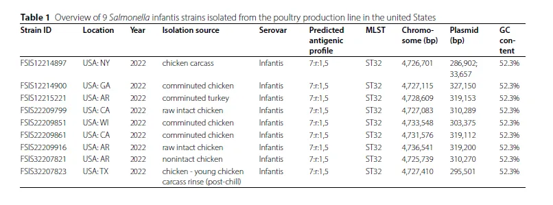 核心模型/材料: 2022年从美国各地(NY, GA, AR等)禽类生产线上分离的9株婴儿沙门氏菌,样本来源包括鸡肉碎、整鸡、非整鸡和鸡胴体。