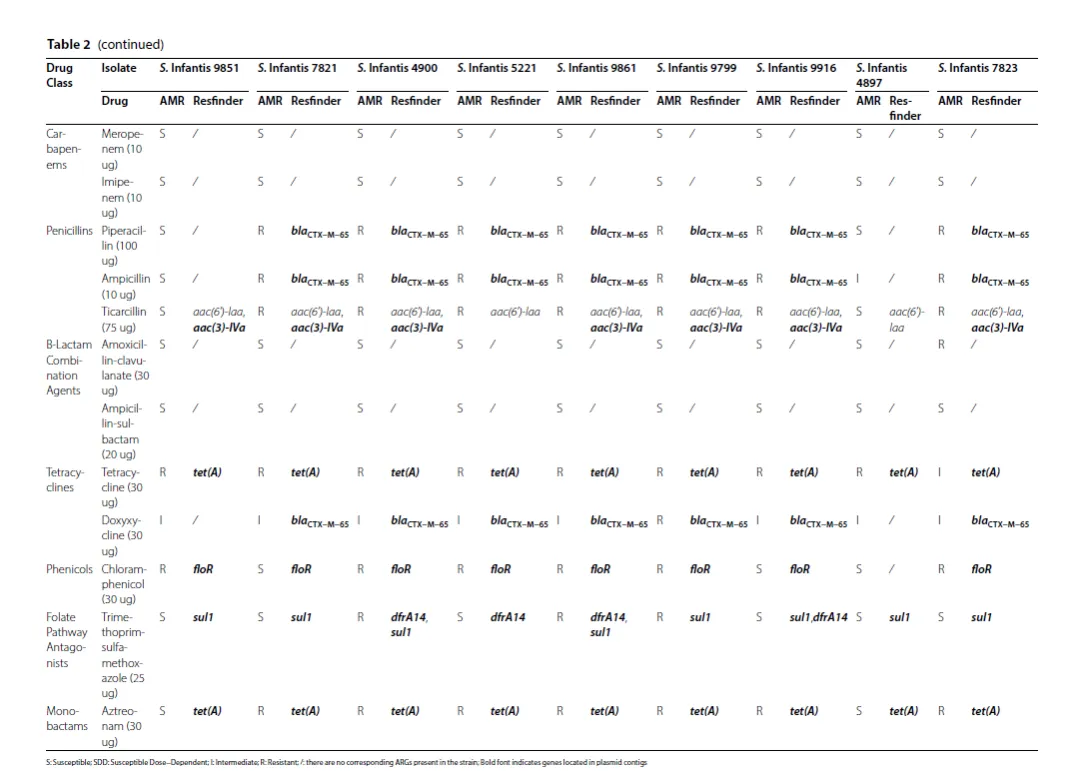 核心发现: 确认了9株来自不同州和鸡肉产品的婴儿沙门氏菌,均为ST32型。大部分菌株对5种及以上抗生素耐药,被定义为多重耐药菌株。