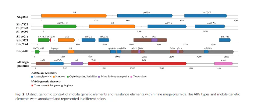 结构可视化: Fig. 2 直观地展示了巨型质粒上耐药基因和MGEs的线性排列,堪称“耐药岛”的建筑蓝图,将抽象的“可移动元件驱动耐药”概念具象化。