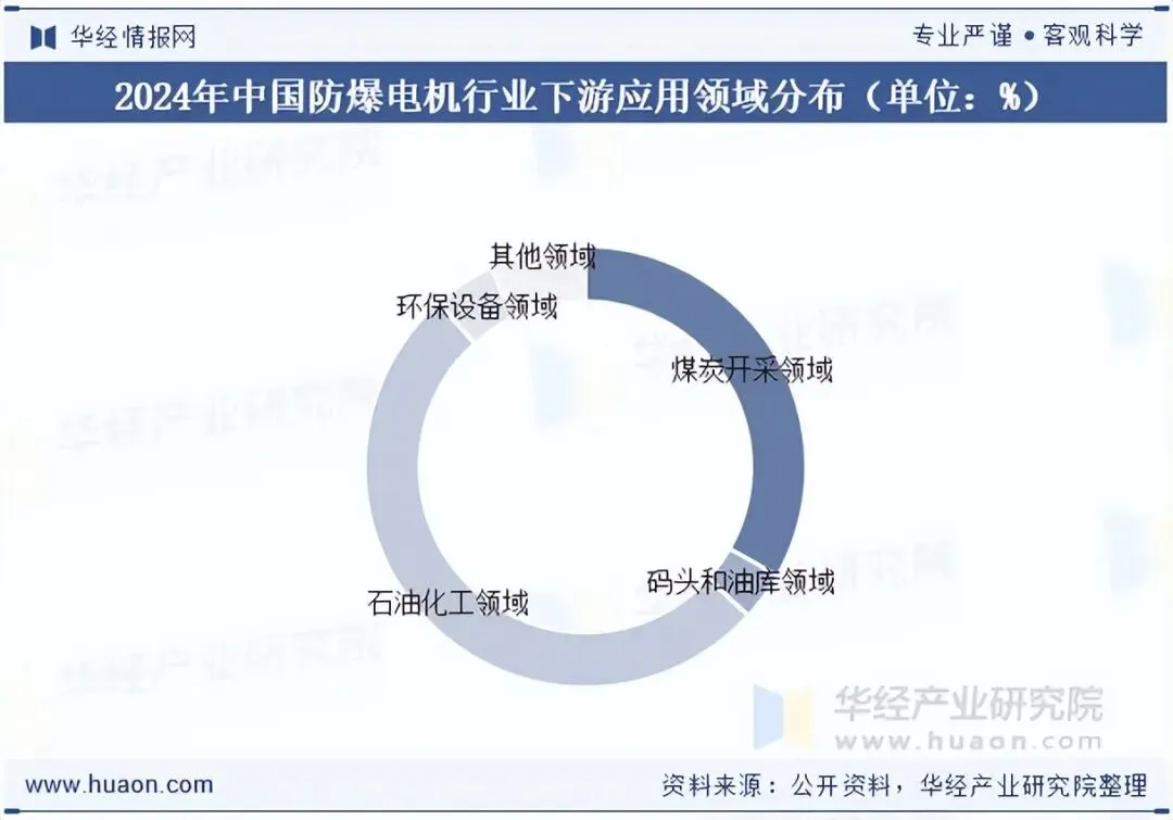 防爆电机广泛应用于国民经济的多个领域,其下游行业包括煤炭开采、码头油库、石油化工、环保设备等领域,下游国民经济的持续发展为防爆电机产业提供有力支撑。2024年我国防爆电机在石油化工领域应用占比为51.58%,煤炭开采领域应用占比为33.23%,环保设备、码头和油库领域应用分别占比为4.6%与3.55%,其他领域应用占比为7.04%。