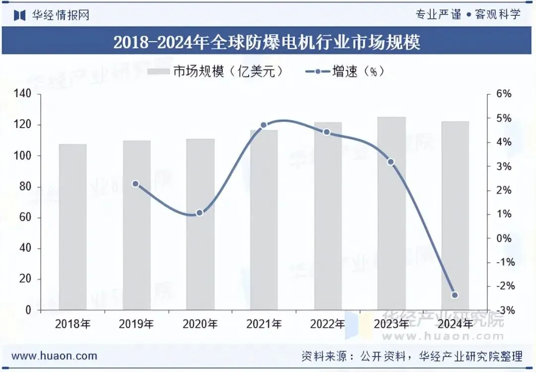 防爆电机是应用于具有爆炸性气体或粉尘环境的特种电机,广泛使用在石油、石化、化工、煤矿、水泥、冶金、城市燃气管道等行业,驱动的负载主要为压缩机、水泵、风机及各种动力传输装置。据统计,截至2024年全球防爆电机行业市场规模为122.73亿美元,同比下降2.4%。