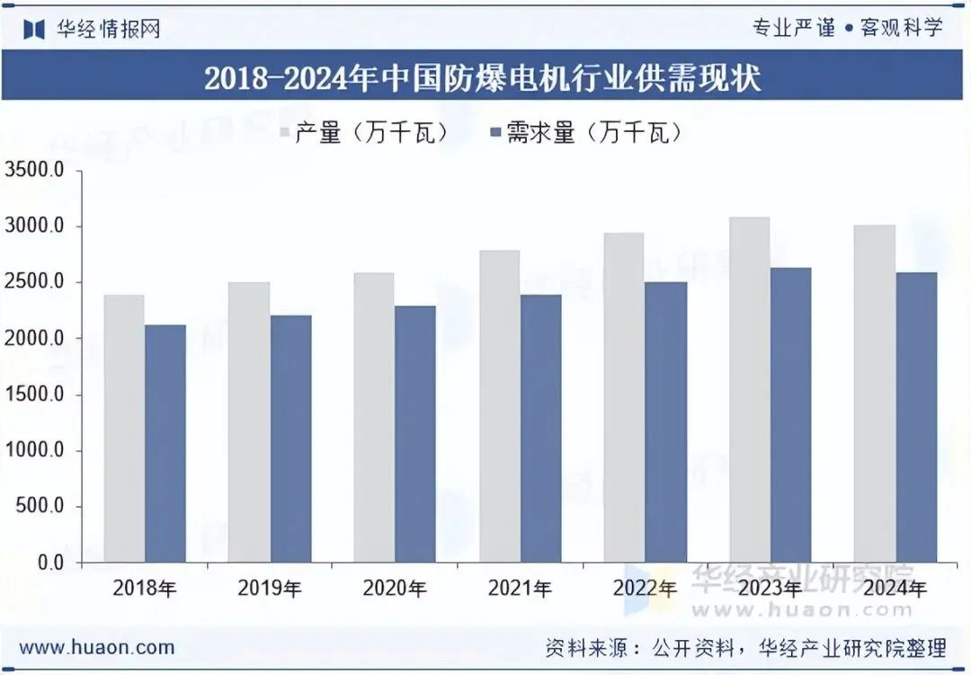 在我国的很多行业领域当中,防爆电机都得到了应用。2024年我国防爆电机行业市场需求不振,整体市场供需出现下滑,据统计,截至2024年我国防爆电机产量为3014.7万千瓦,需求量为2590.8万千瓦。