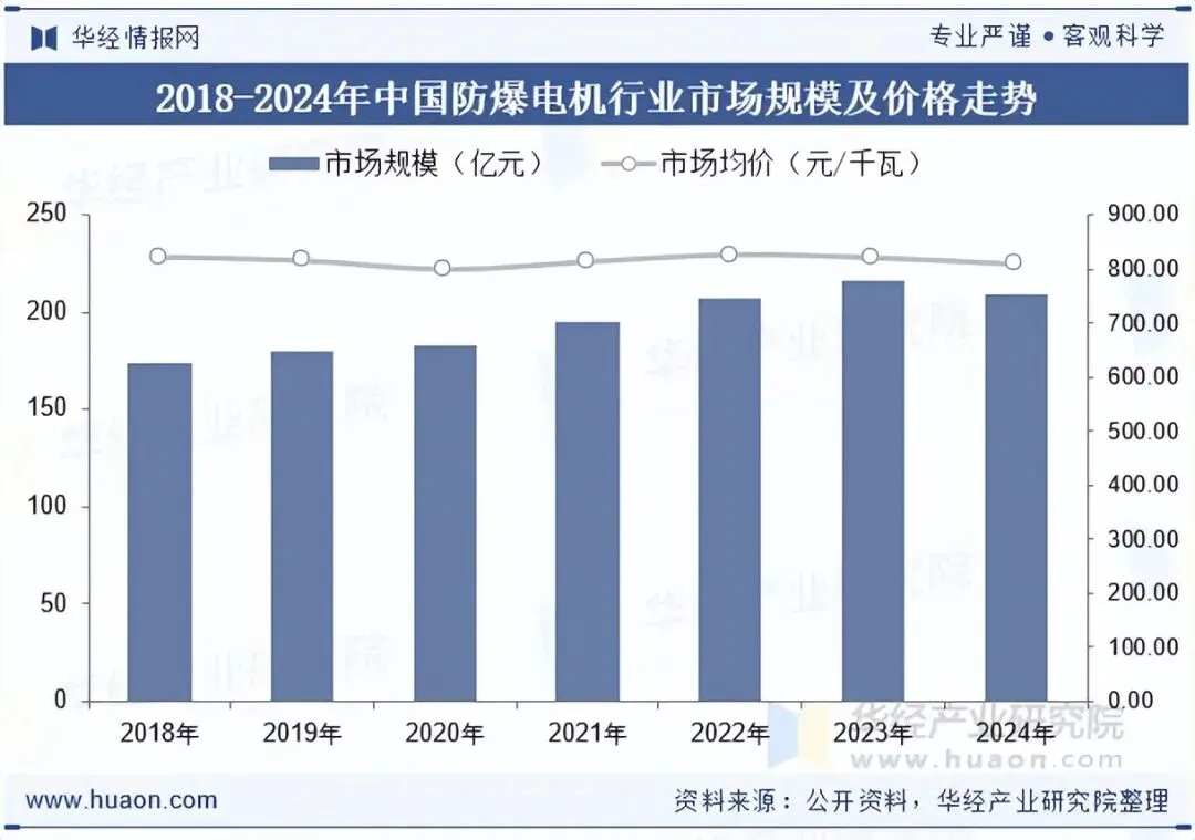 市场规模来看,2024年我国防爆电机国际贸易出口数量减少,经济效益出现下滑,据统计,截至2024年我国防爆电机行业市场规模为209.63亿元,同比下降3.3%,市场均价约为809元/千瓦。