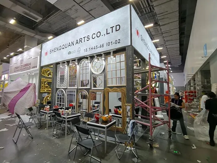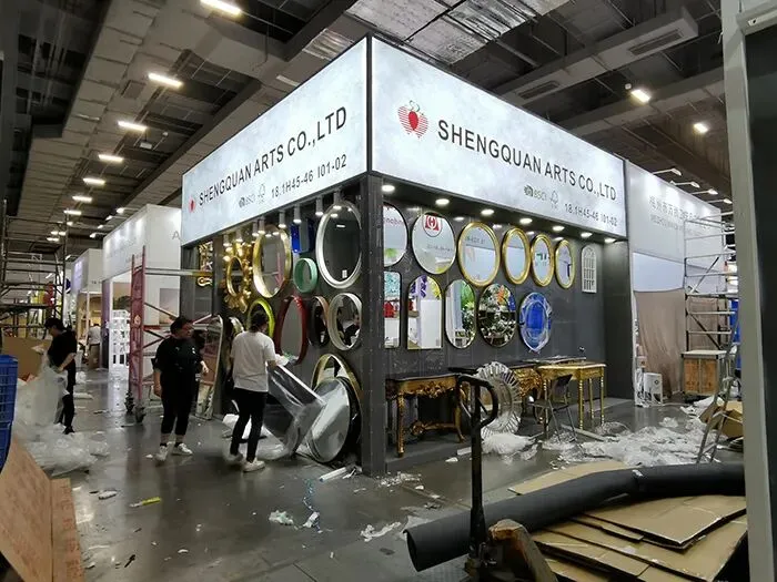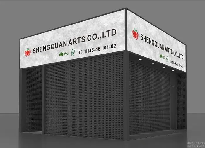 这是盛泉艺术有限公司在广交会上的展台实景。展台以实用主义设计为核心,灰色调背景墙简洁大气,无多余装饰,仅用金属框架支撑起方正结构,透出工业风的冷峻感。配合企业“艺术与科技融合”的核心理念,通过减少物理干扰,让参观者更专注于品牌本身的价值传递。