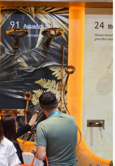 91 AquaArc Series的灵感来自天体划过天际的优雅弧线。设计师将宇宙的宁静与水的流动融为一体,搭配玫瑰金表面处理,每一处弧度都像晨曦划破夜空。该系列是金恩卫浴在本届广交会上的“颜值担当”,吸引了众多追求奢华设计的客户驻足拍照。The 91 AquaArc Series draws inspiration from the graceful arc of celestial bodies tracing the horizon. Designers merged cosmic serenity with the flow of water, finished in rose gold. Every curve feels like dawn breaking through the night sky. This collection was the “standout beauty” of KINEN’s booth, attracting many buyers seeking luxury design.