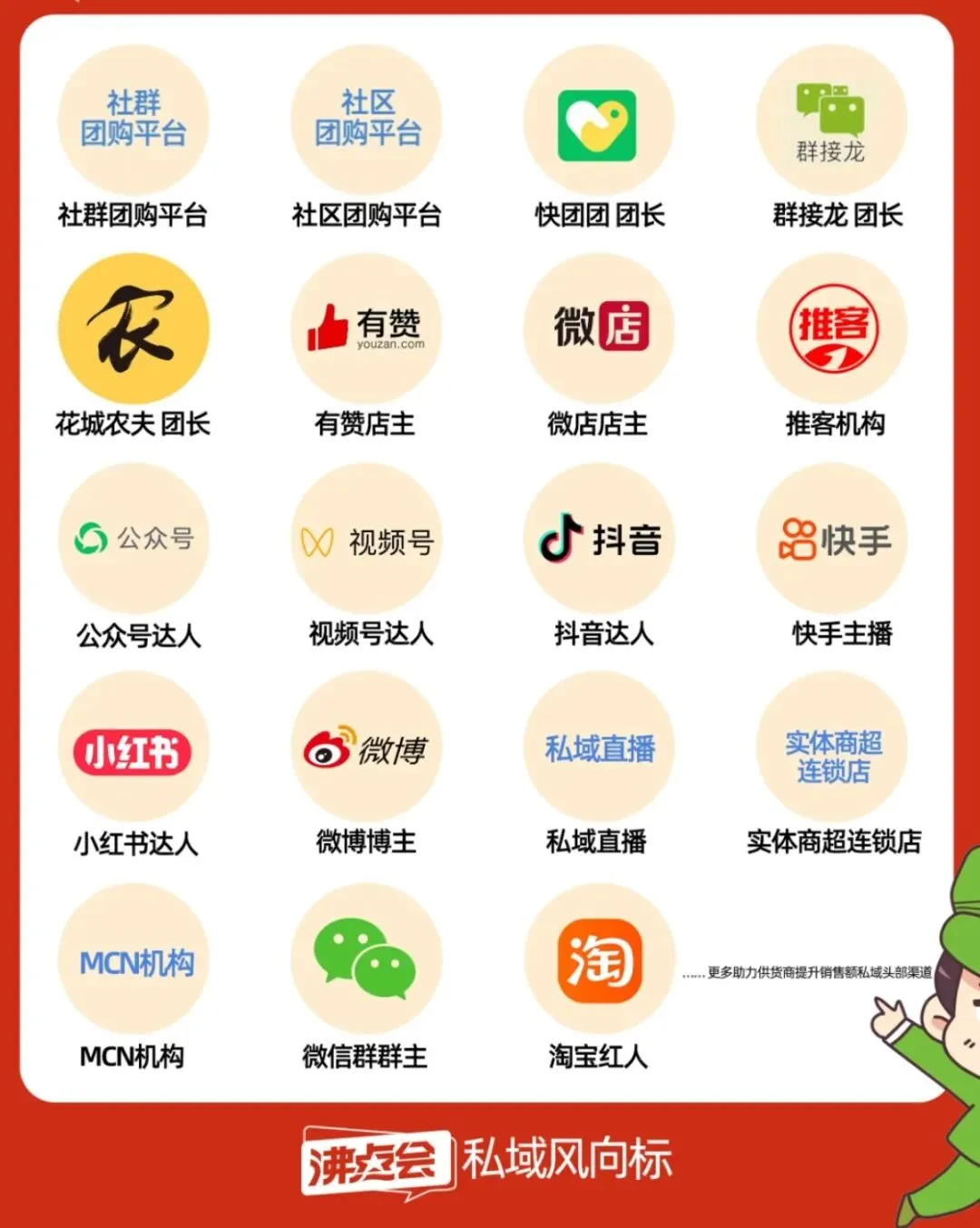 渠道涵盖私域五大体系、十大工具渠道,有快团团、群接龙、社群团购、微店、有赞、鲸灵、爱库存、视频号达人、抖音快手达人、推客机构等,不用你一个个找。