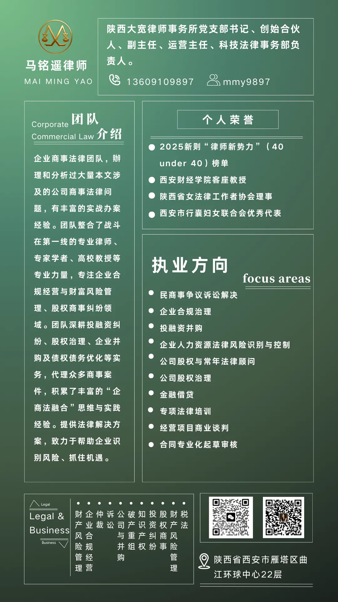 马铭遥律师团队专注企业合规经营与财富风险管理、股权商事纠纷领域。团队律师深耕投融资纠纷、股权治理、企业并购及债权债务优化等实务,代理众多商事案件,积累了丰富的“企商法融合”思维与实践经验。我们不仅提供法律解决方案,更致力于帮助企业识别风险、抓住机遇。欢迎志同道合者探讨交流,感兴趣的企业家朋友欢迎私信联系。