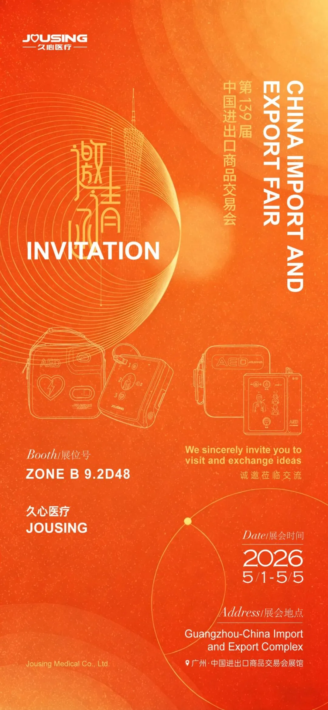 The 139th Canton Fair is now in full swing, and Jousing will make a splendid appearance in Phase III with a range of innovative products. We sincerely invite domestic and international customers and partners to visit the Jousing booth to explore the development and innovative construction of pre-hospital emergency systems together.