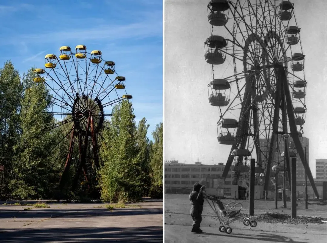 普里皮亚季露娜公园(Pripyat’s Luna Park)的摩天轮原计划于1986年5月1日盛大开放。那场开幕仪式从未到来,如今新生的树木已从周围的柏油地面中破土而出。左图:Darmon Richter;右图:Petr Vyhovsky/PRIPYAT-CITY.RU。