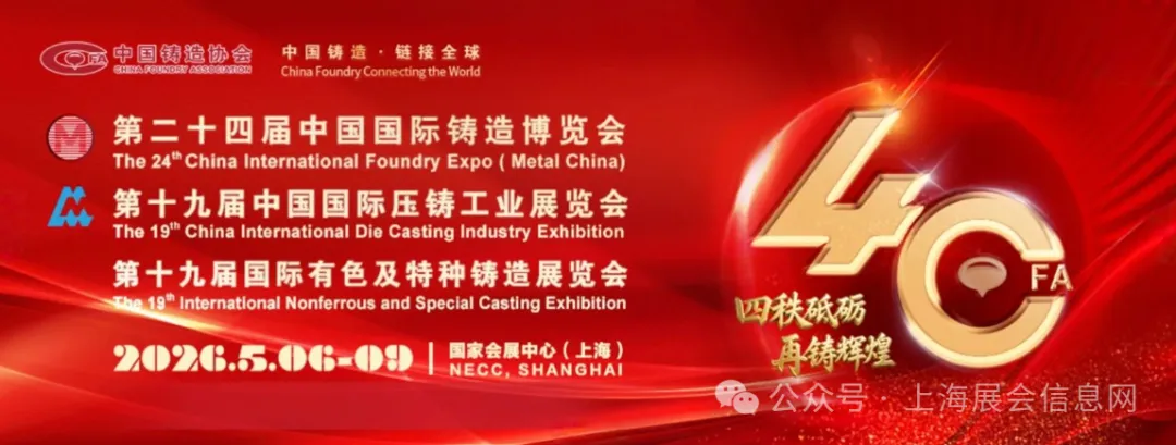 二十四届中国国际铸造博览会(METAL CHINA)、第十九届中国国际压铸工业展览会(DIECASTING CHINA)与第十九届国际有色及特种铸造展览会(NONFERROUS CHINA)即将于2026年5月6-9日在国家会展中心(上海)拉开序幕!展会以“绿色发展·智向未来”为主题,12万平米的壮阔舞台,将汇聚1200余家行业翘楚,迎接来自60多个国家和地区的15万人次专业观众。