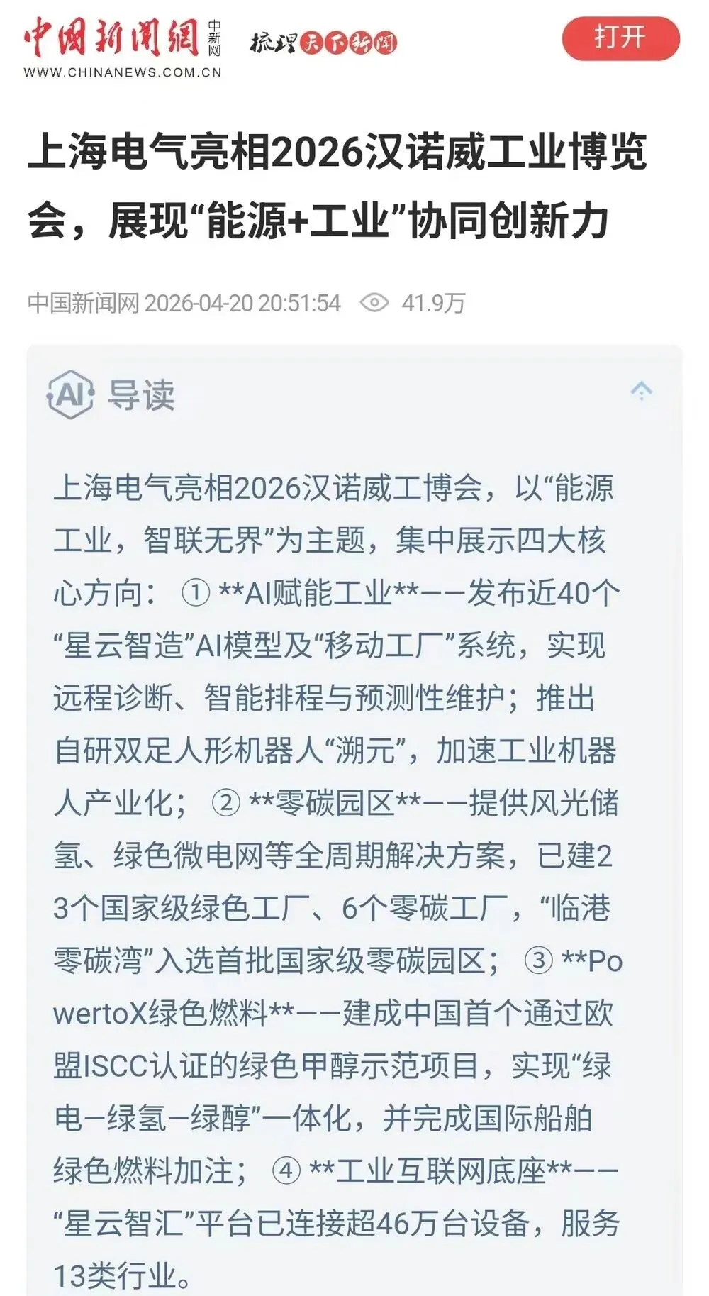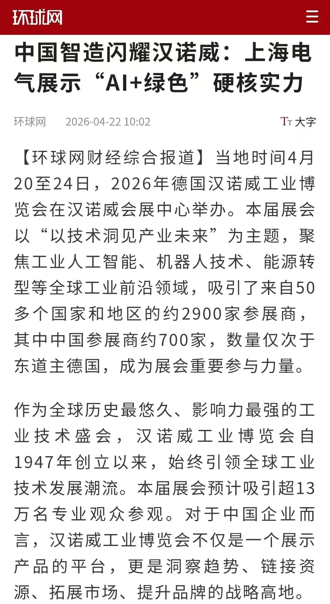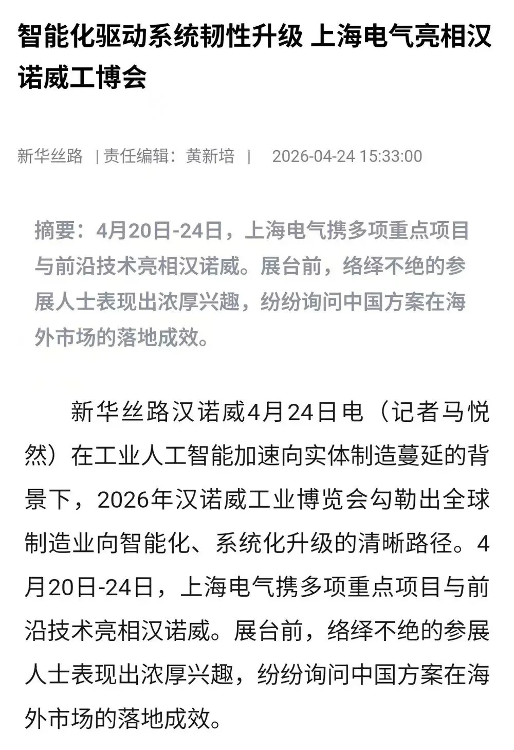 媒体聚焦|亮相2026汉诺威工业展,上海电气「AI+绿色」方案获多家央媒关注