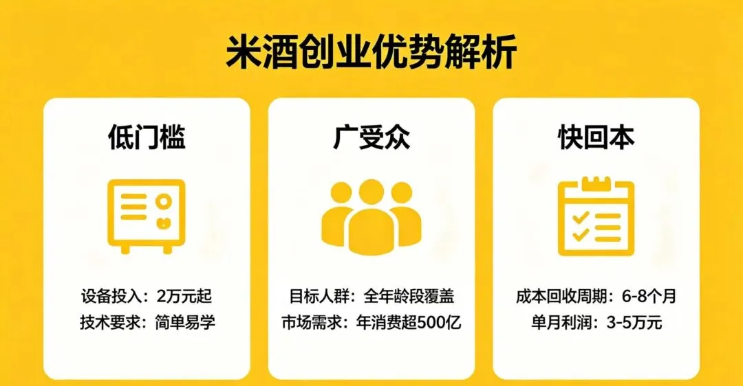 无需大型专业酿酒设备,基础发酵器具即可投产。原料以糯米、大米为主,采购成本可控,单斤生产成本可控制在5元以内,利润空间高达60%以上。