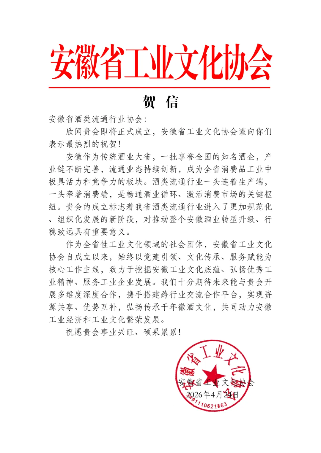 据了解,在该协会成立之际,安徽省工业文化协会专门发去贺信,高度肯定协会成立对弘扬徽酒文化、促进产业融合的重要意义,并期待双方在酒类文化推广及产业链协同等领域开展深度合作。