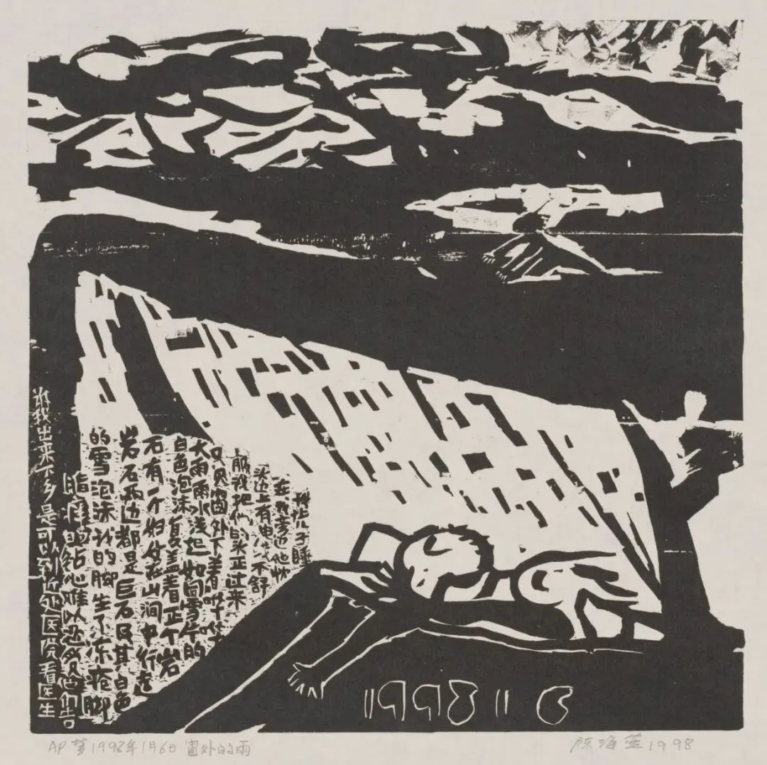 梦1998年6月1日窗外的雨(木刻)40x40cm陈海燕1998