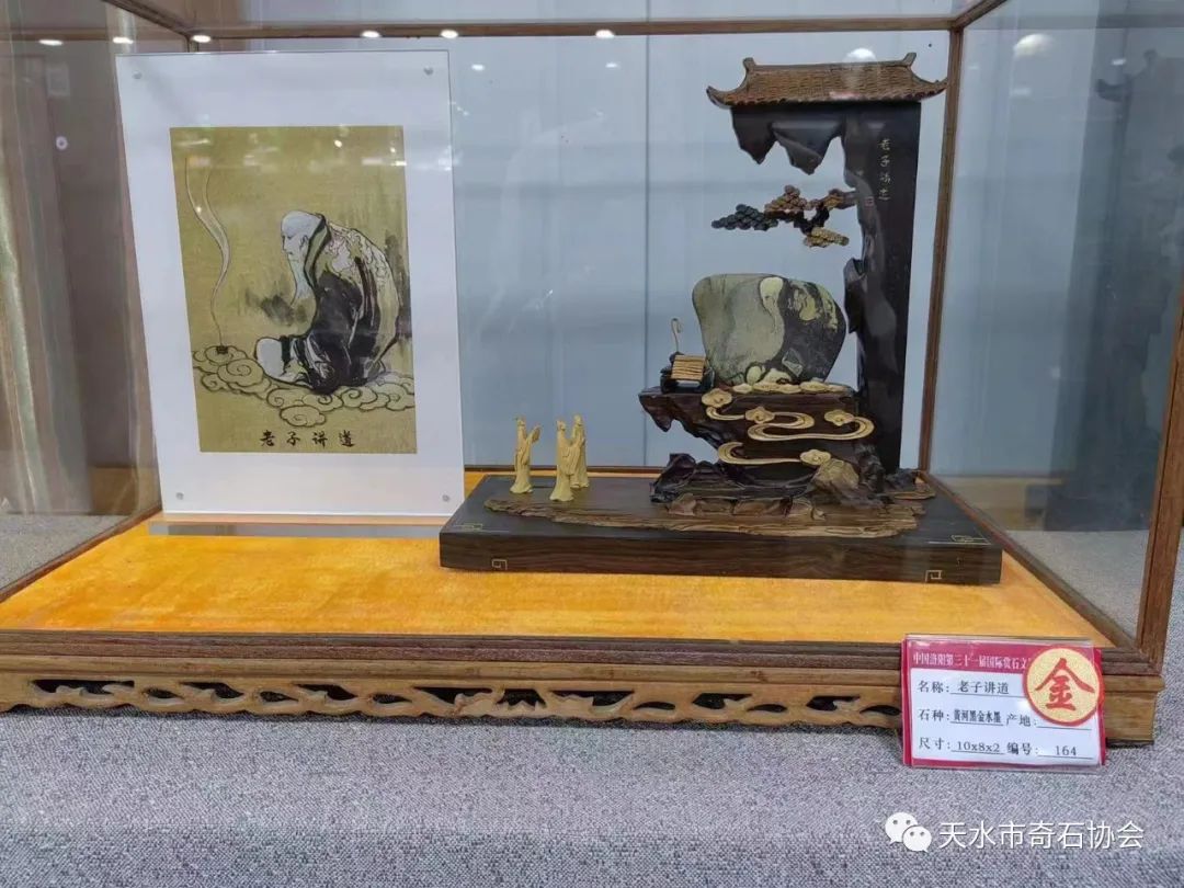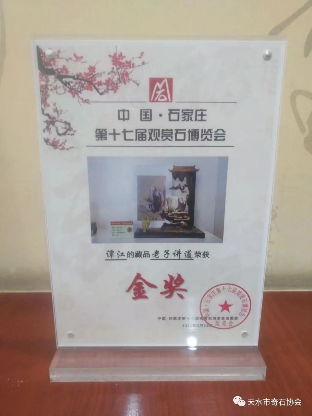 天水市奇石协会武山县协会副会长谭江先生选送的《老子讲道》获金奖。