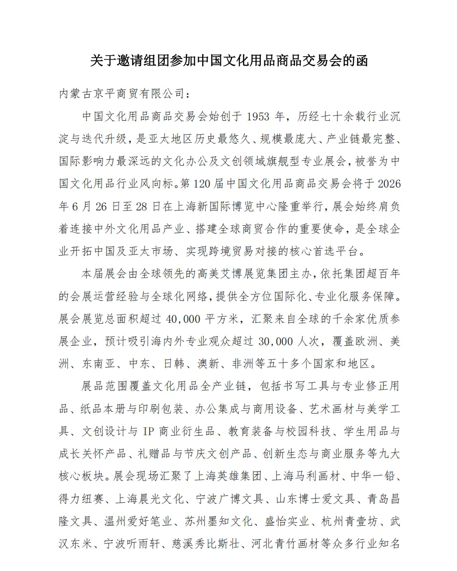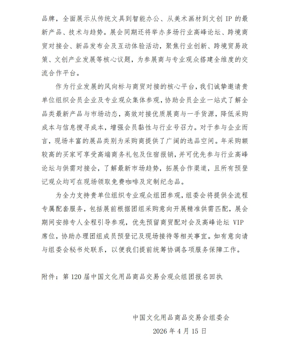 关于邀请组团参加中国文化用品商品交易会的函