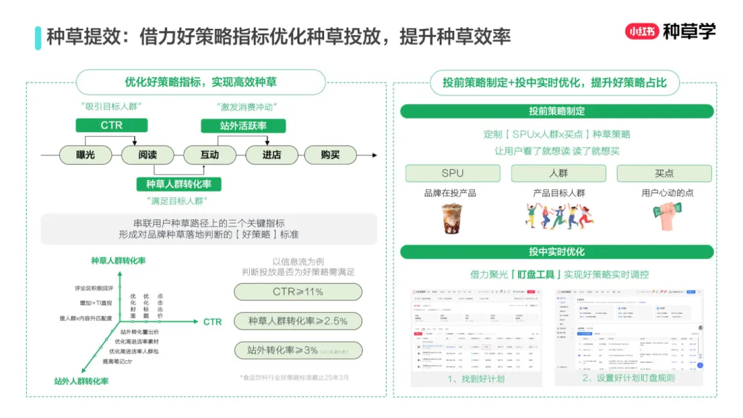 • 高效种草“好策略”标准:需同时满足CTR≥11%、种草人群转化率≥2.5%、站外转化率≥3%(以小红星为例),通过聚光“盯盘工具”实时优化封面、标题与人群包,提升内容投产比。