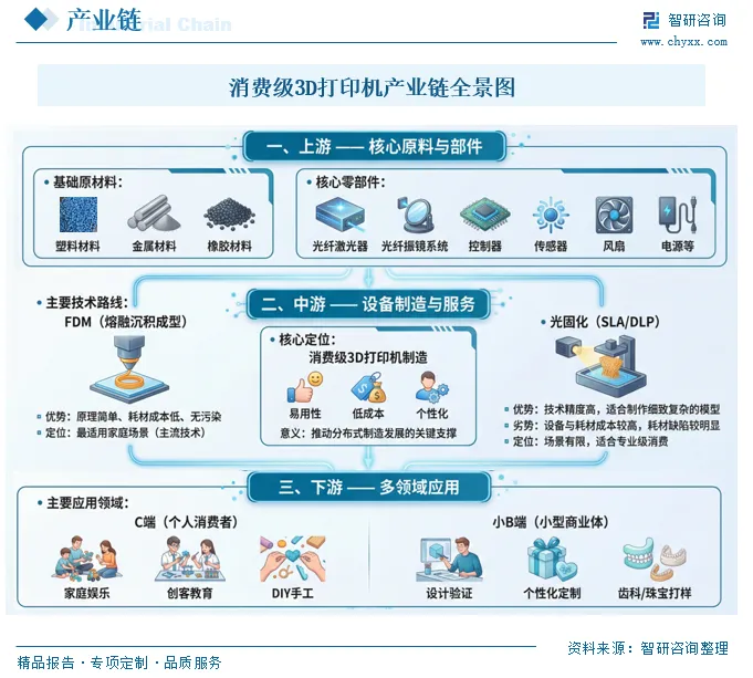 消费级3D打印机产业链包括上游核心原料与部件,中游设备制造与服务,下游多领域应用三个环节,原材料包括塑料、橡胶、玻璃及钢材、铝材等金属材料等,核心零部件涉及光纤激光器、光纤振镜系统、控制器、传感器、风扇、电源等。中游为消费级3D打印机制造,相比工业级,消费级3D打印机强调易用性、低成本与个性化,是推动分布式制造发展的关键支撑。消费级3D打印机技术路线包括FDM、光固化:1)FDM:操作原理简单,耗材成本低且无污染,最适用家庭场景,是主流技术路线。2)光固化:技术精度更高,同时成本更高,且耗材缺陷较为明显,限制了其应用场景的扩展,更适合制作高度细致复杂的模型。下游消费级3D打印机主要用于C端&小B端。