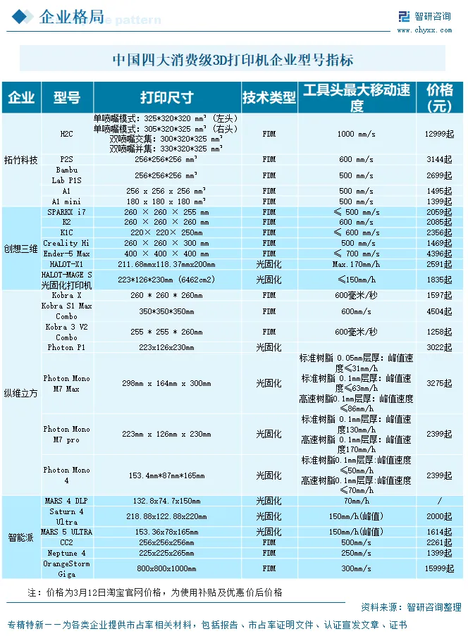 从拓竹科技、创想三维、纵维立方、智能派四大品牌来看,拓竹科技产品采用FDM技术,售价从千元到万元不等,H2C型号产品工具头最大移动速度达1000mm/s。创想三维、纵维立方、智能派则采取双技术并行策略,同步布局FDM与光固化两大技术路线,以此兼顾不同使用场景与用户层级的需求,产品定价多集中在数千元的主流消费级区间。