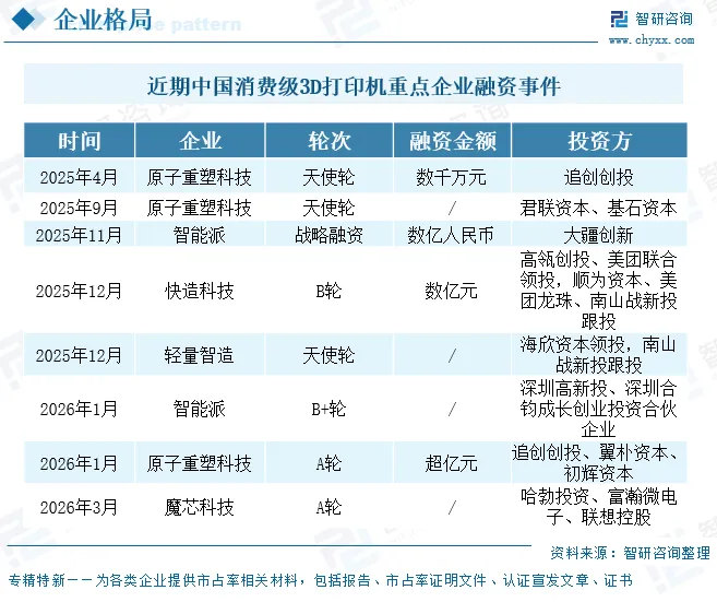 近期,消费级3D打印机赛道资本市场活跃度较高,多家头部与新锐企业密集完成融资。成立于2025年的原子重塑科技相继斩获3轮融资,智能派也分别于2025年11月、2026年1月完成2轮融资,投资方包括大疆创新等。快造科技、轻量智造、魔芯科技也成功获得投资。资本的持续注入不仅为企业技术研发、产品迭代与市场拓展提供了坚实资金支撑,也为行业发展注入了强劲动能,将推动消费级3D打印机行业加速技术创新、场景落地与市场普及,迈向更高质量的规模化发展阶段。