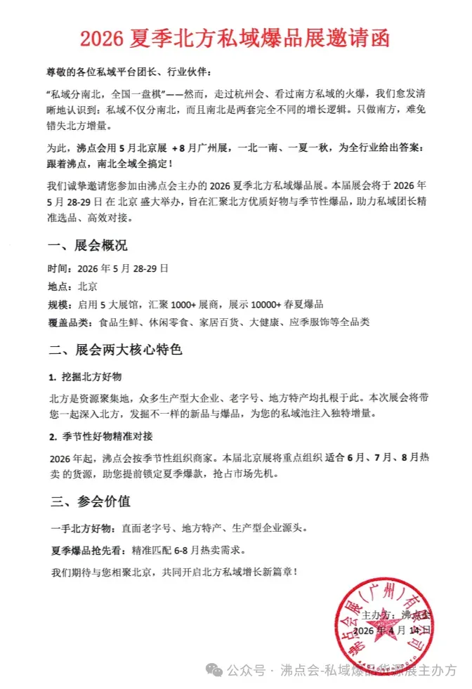 我们诚挚邀请您参加由沸点会主办的2026夏季北方私域爆品展。本届展会将于2026年5月28-29日 在 北京 盛大举办,旨在汇聚北方优质好物与季节性爆品,助力私域团长精准选品、高效对接。