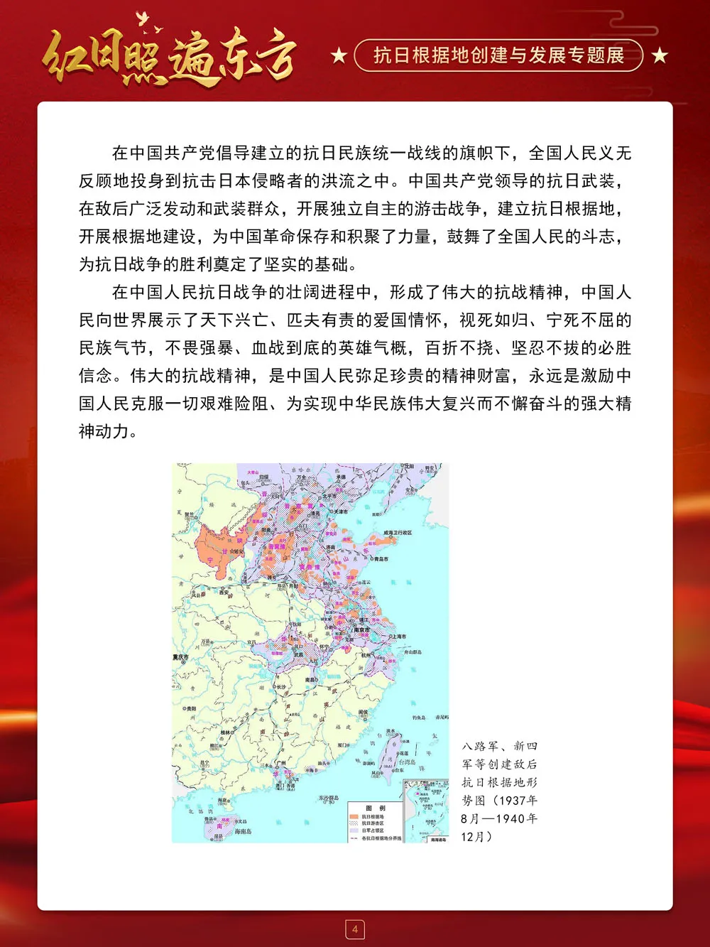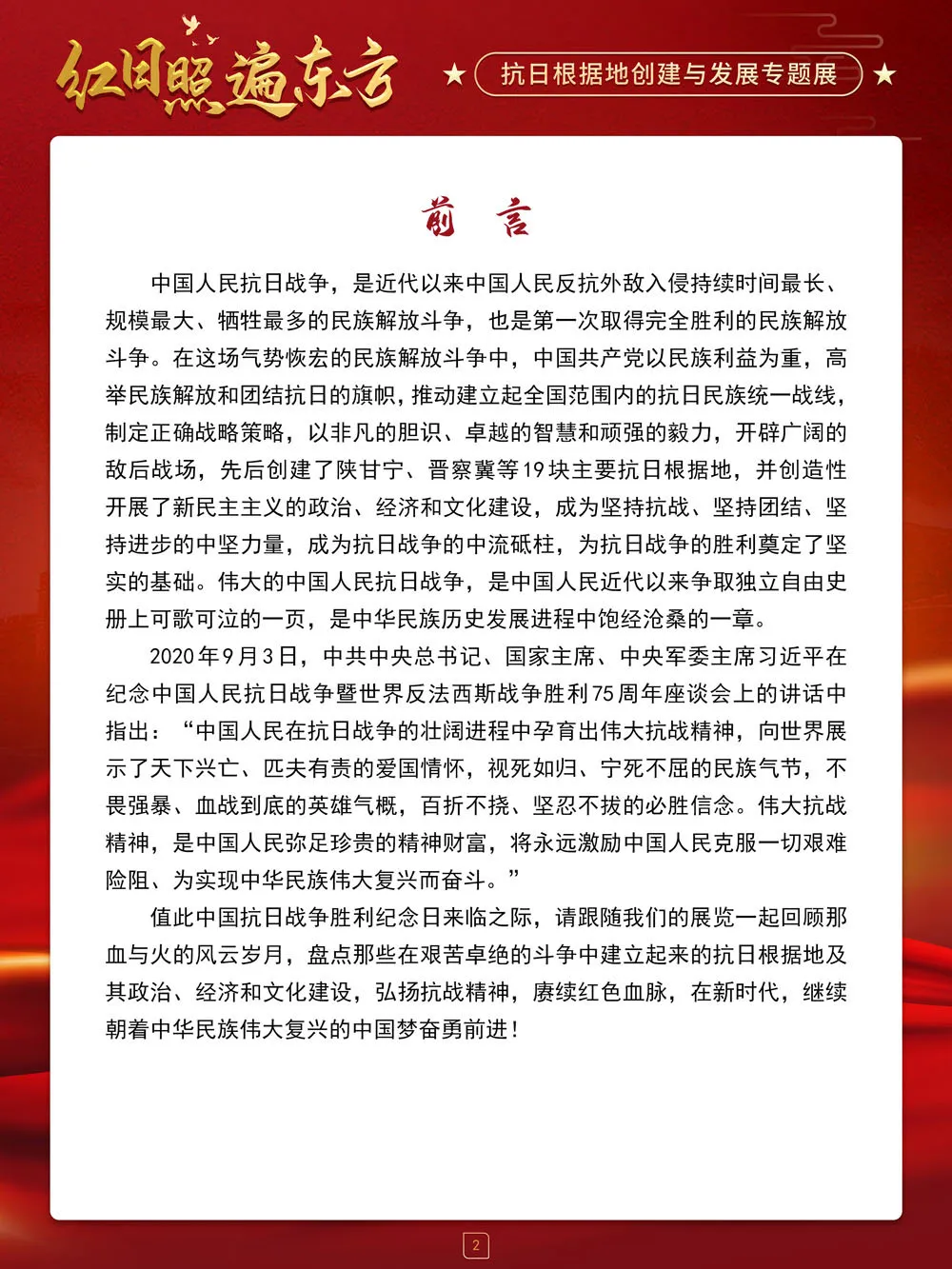 值此中国人民抗日战争胜利纪念日来临之际,请跟随我们的展览一起回顾那血与火的风云岁月,盘点那些在艰苦卓绝的斗争中建立起来的抗日根据地及其政治、经济和文化建设,弘扬抗战精神,赓续红色血脉,在新时代,继续朝着中华民族伟大复兴的中国梦奋勇前进!