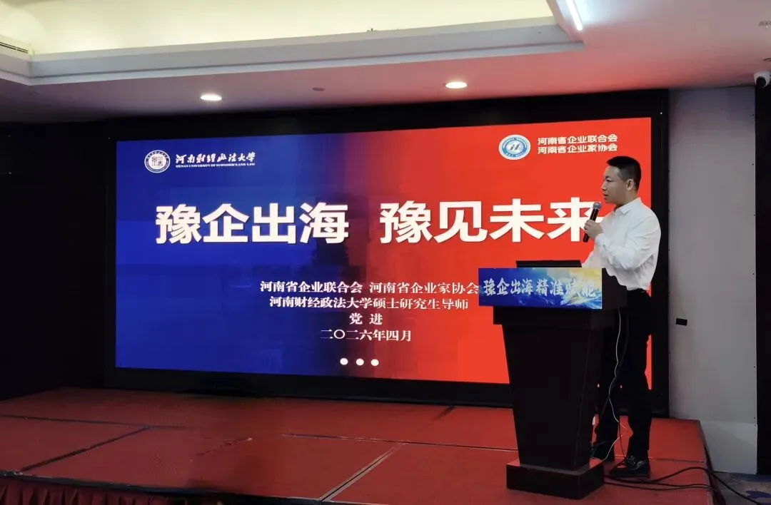 豫企扬帆向世界,精准赋能启新程。4月24日,2026“豫企出海 精准赋能”商协会交流座谈会在郑州举行。本次座谈会由河南省企业联合会/河南省企业家协会(以下简称河南省企联)与河南财经政法大学中国(河南)企业出海研究院(以下简称企业出海研究院)共同主办,旨在收集企业出海的真实需求,凝聚各方智慧,共商发展大计。来自河南省企联、企业出海研究院的代表,各省辖市企联、特邀商协会的会长、秘书长等50余人齐聚一堂,共谋出海新篇。 河南财经政法大学中国(河南)企业出海研究院秘书长韩亚峰首先致欢迎辞。他介绍了企业出海研究院的成立背景与基本情况,指出研究院始终秉持“立足中原、放眼全球”的定位,依托“商协会+高校研究院”的协同机制,汇聚政产学研用各方资源,致力于为豫企出海提供全链条智力支撑与精准服务,助力企业高效、稳健地走向世界舞台。